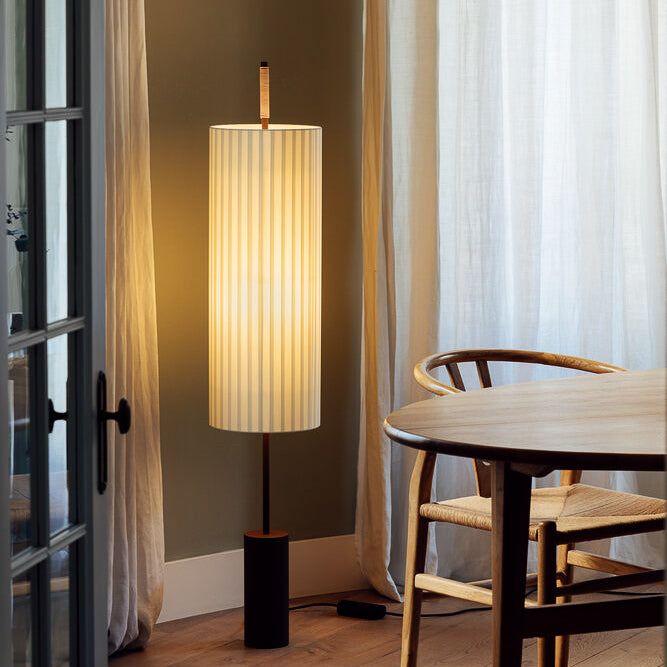 Dorica floor lamp with natural bookbinding ribbon and metal structure. Dimmable. Designed in 1994.