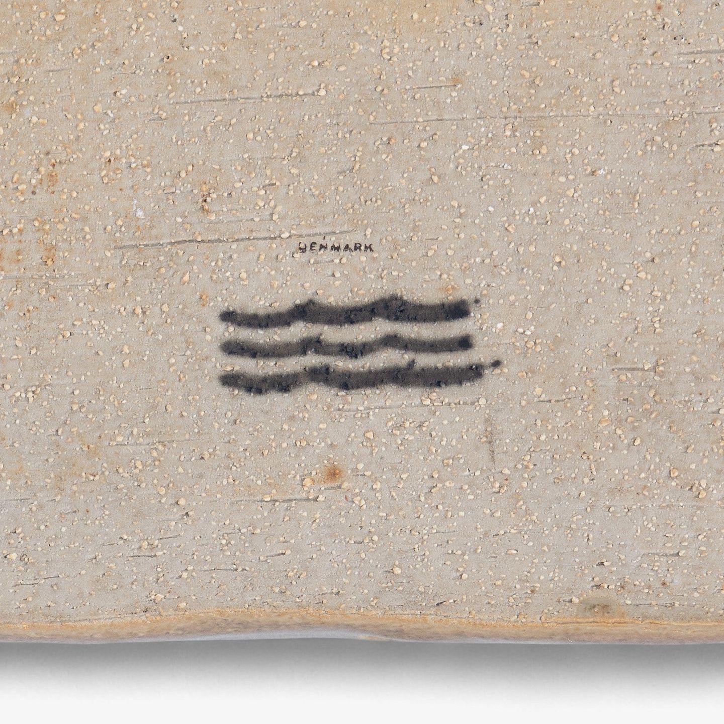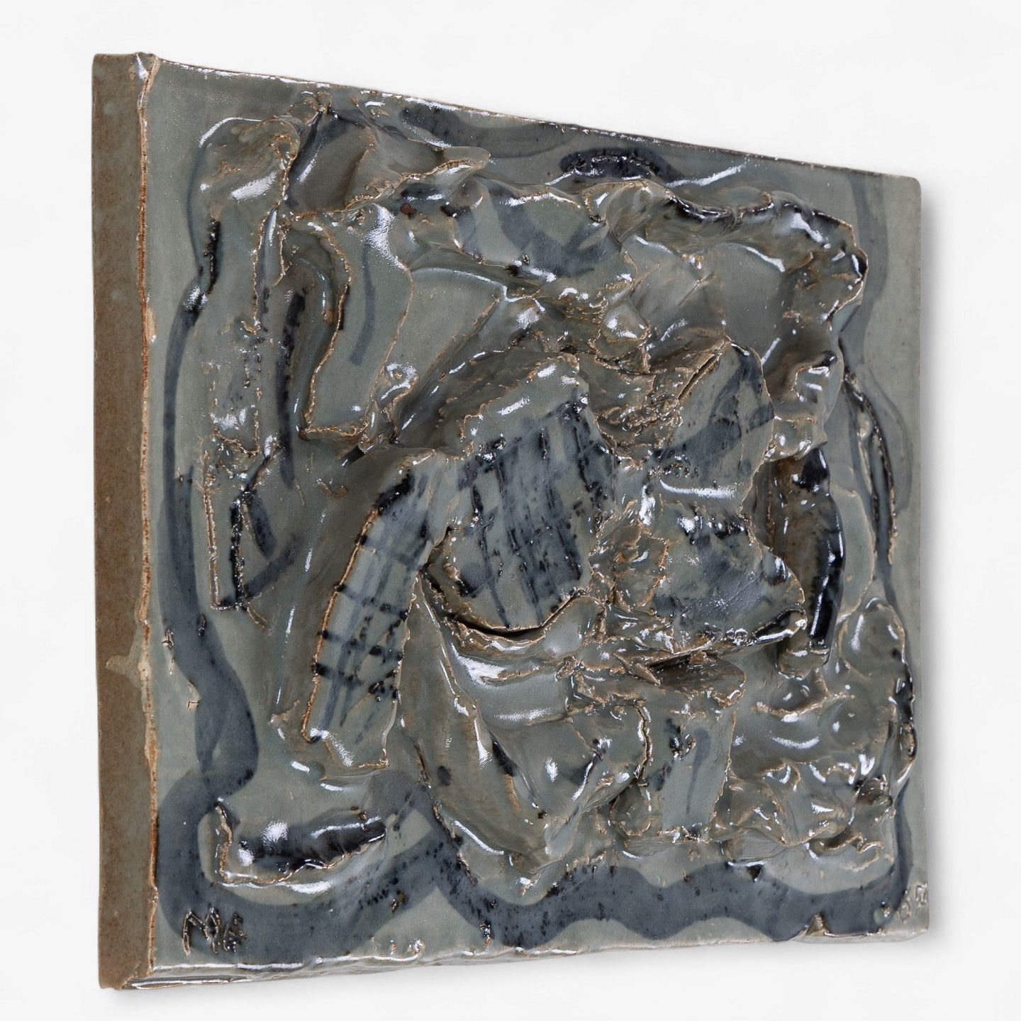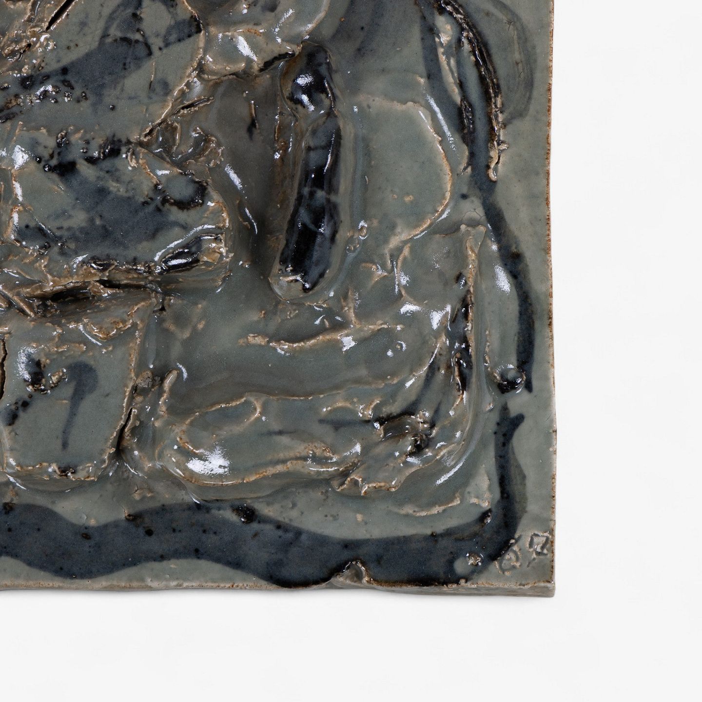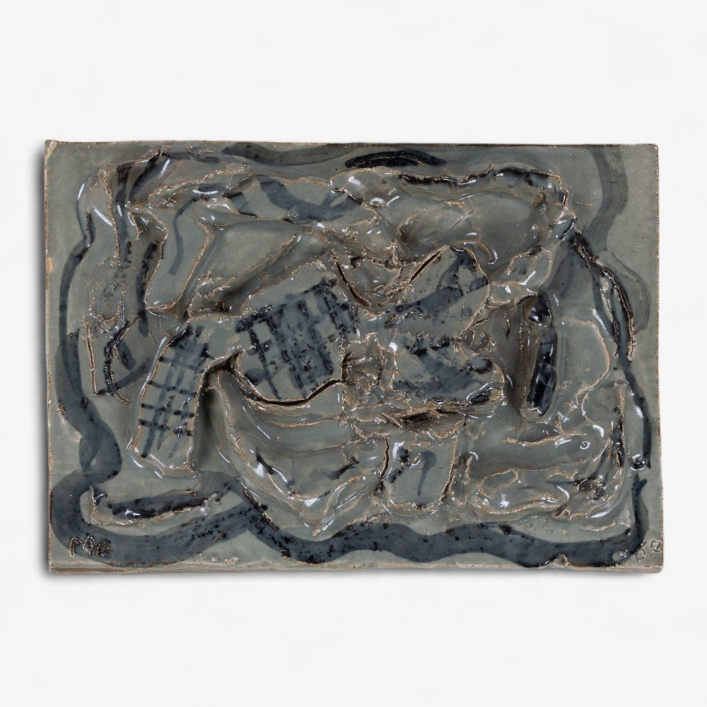 Stoneware relief with abstract shapes and greenish glaze. Signed, MA 67. Manufacturer's stamp.