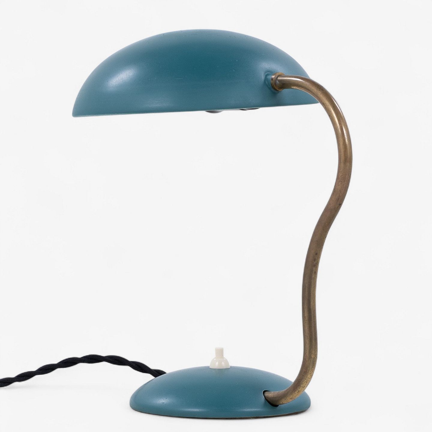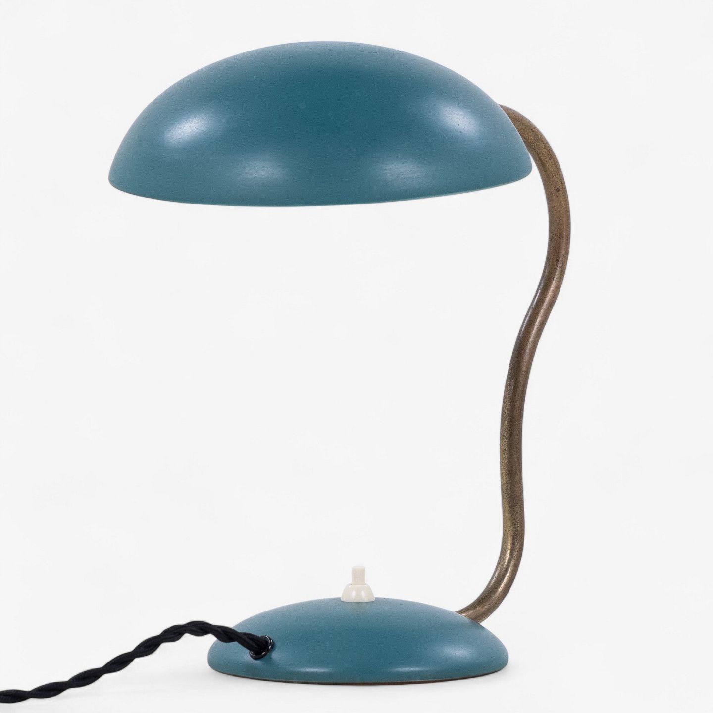 Model E1325 - Table lamp in green lacquered metal with adjustable brass arm.