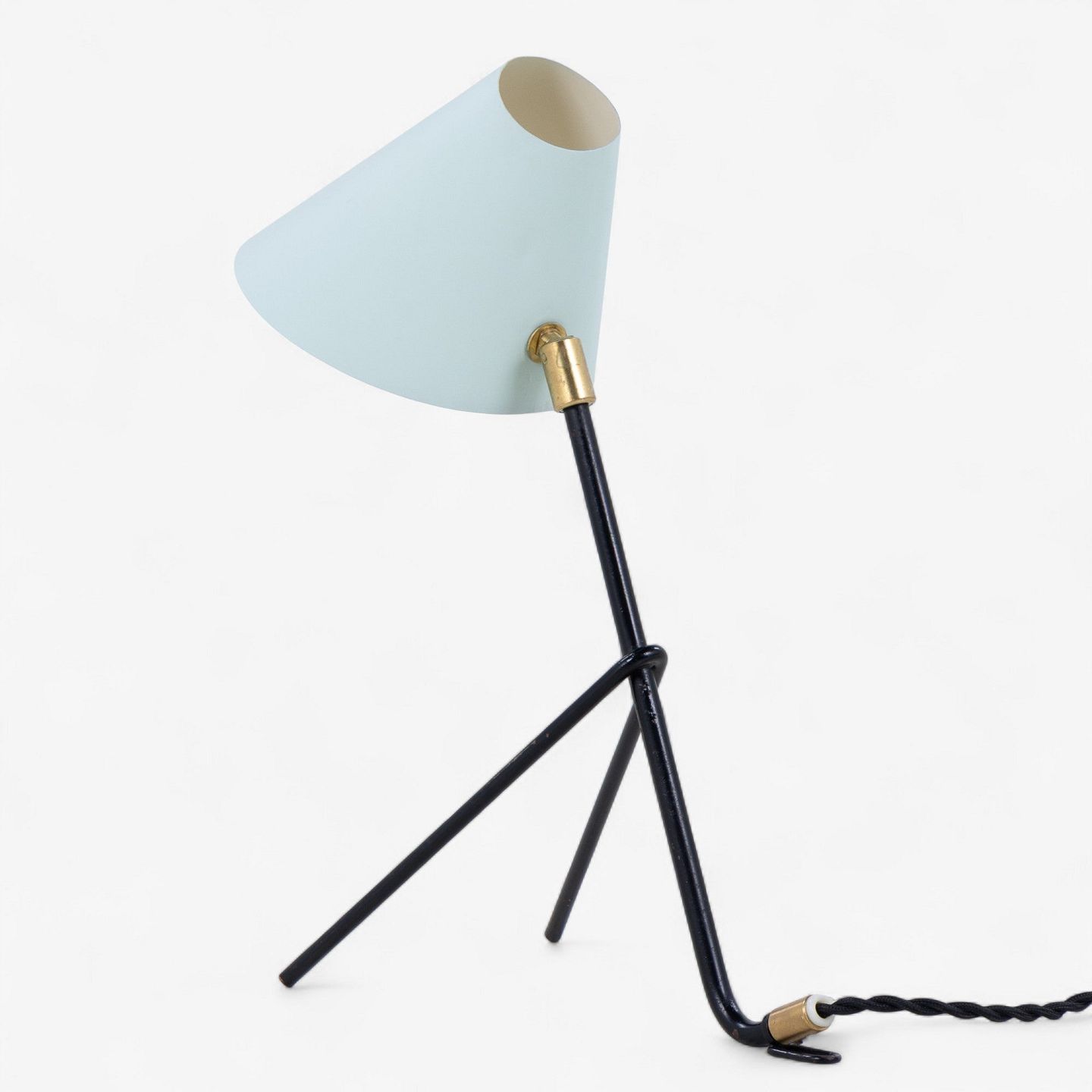 Table lamp in black lacquered metal with brass details and blue shade.