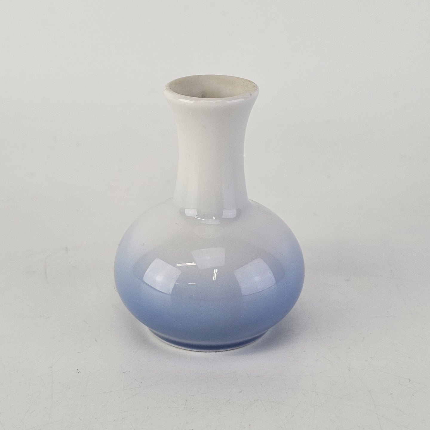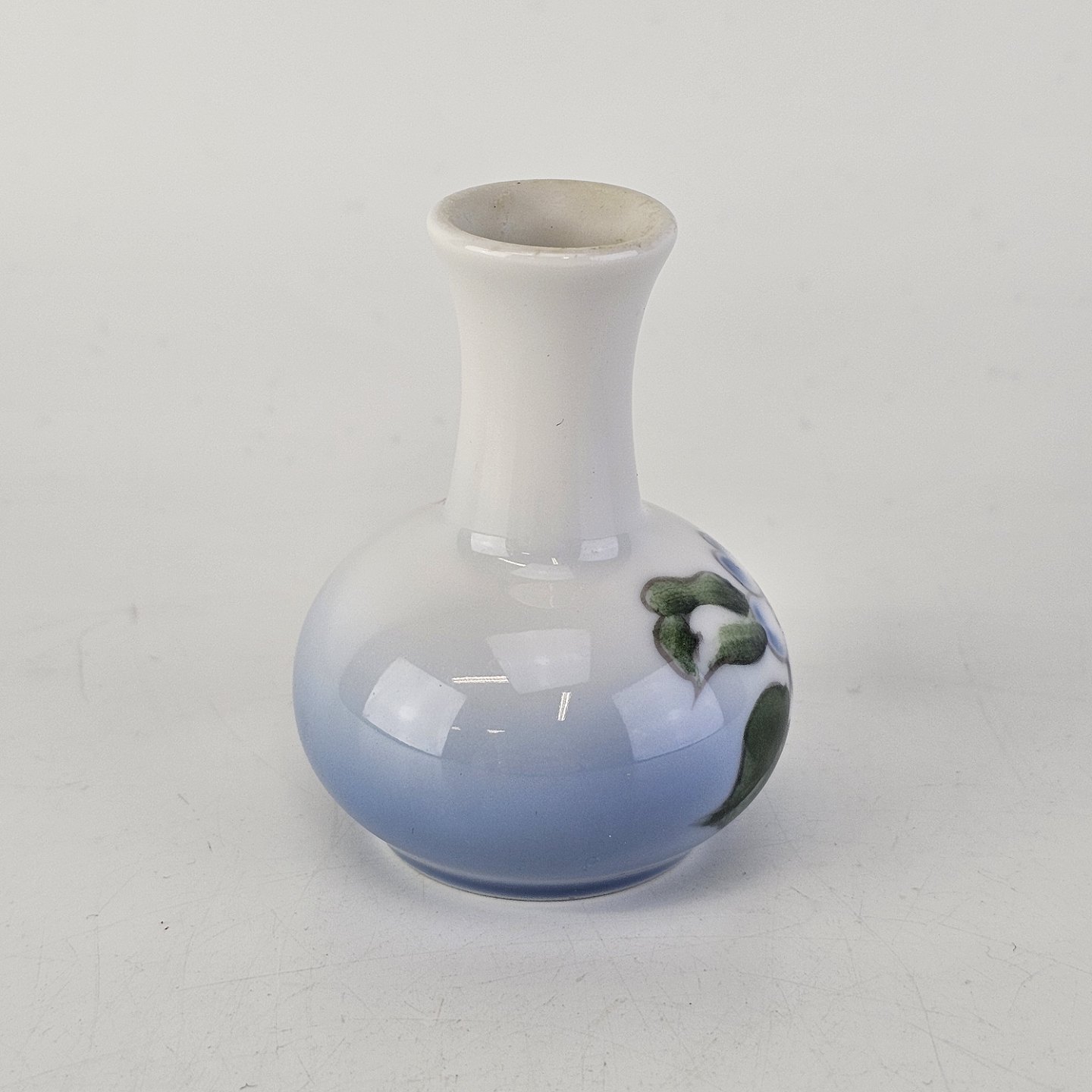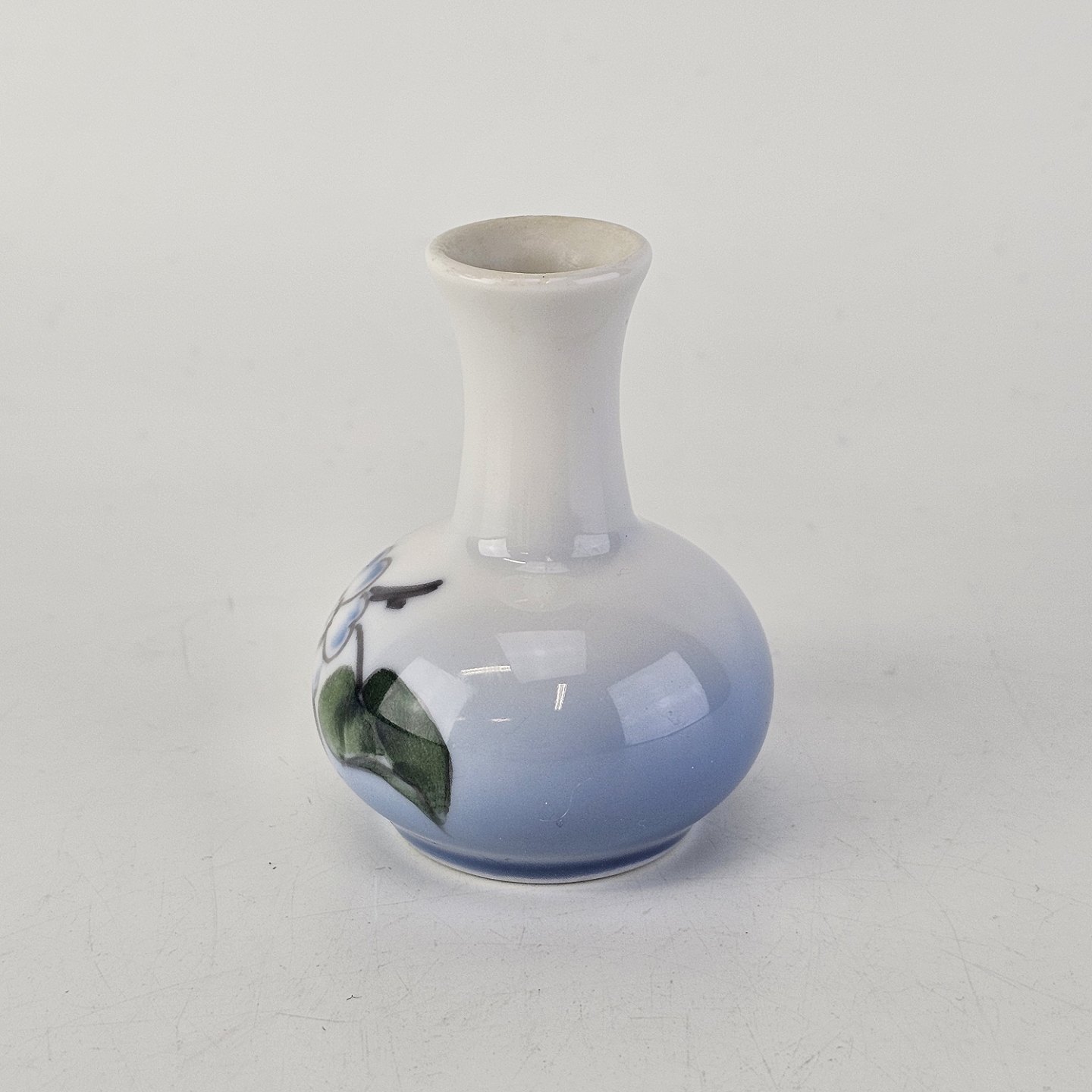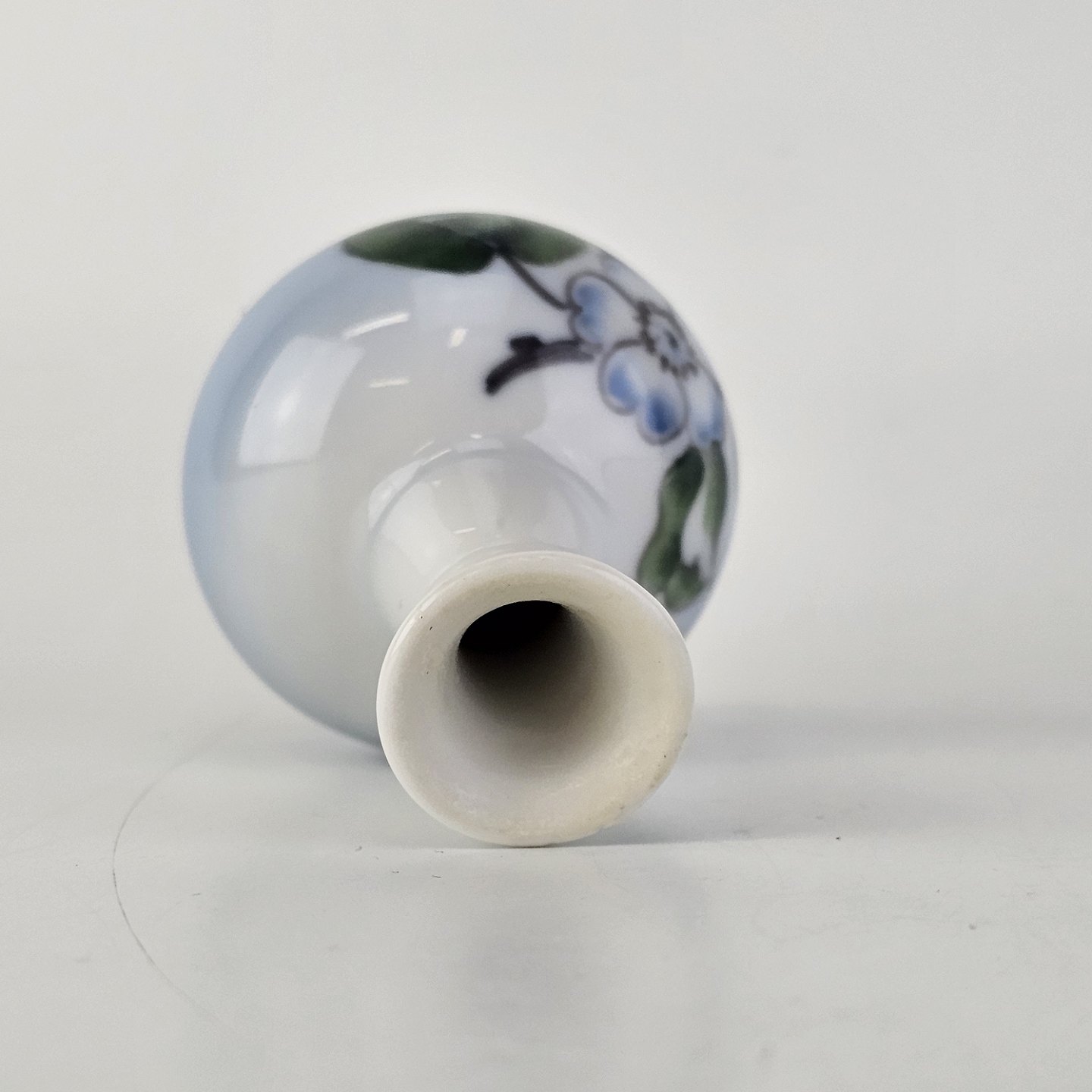 Miniature vase i porcelæn med motiv af en æbleblomst på gradueret blå baggrund