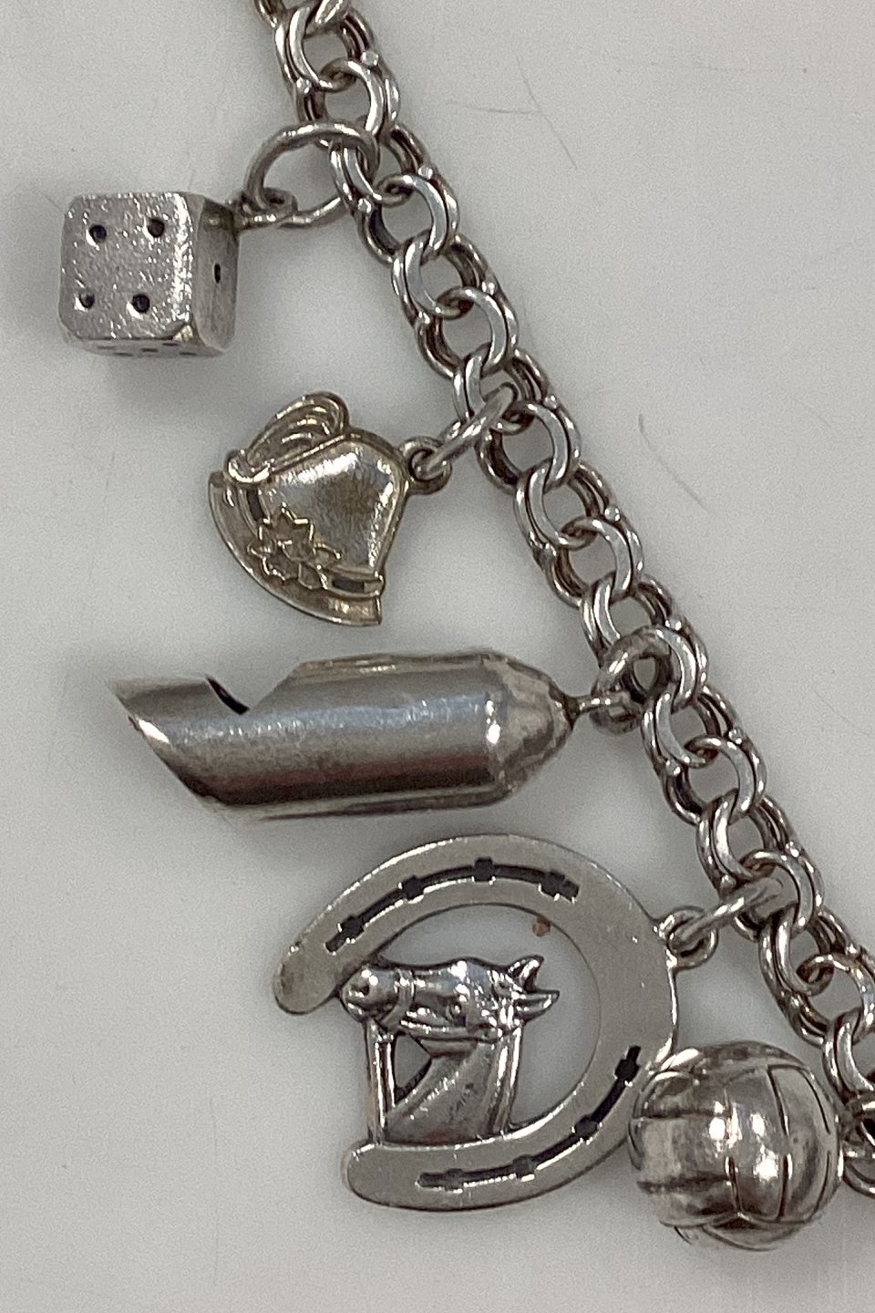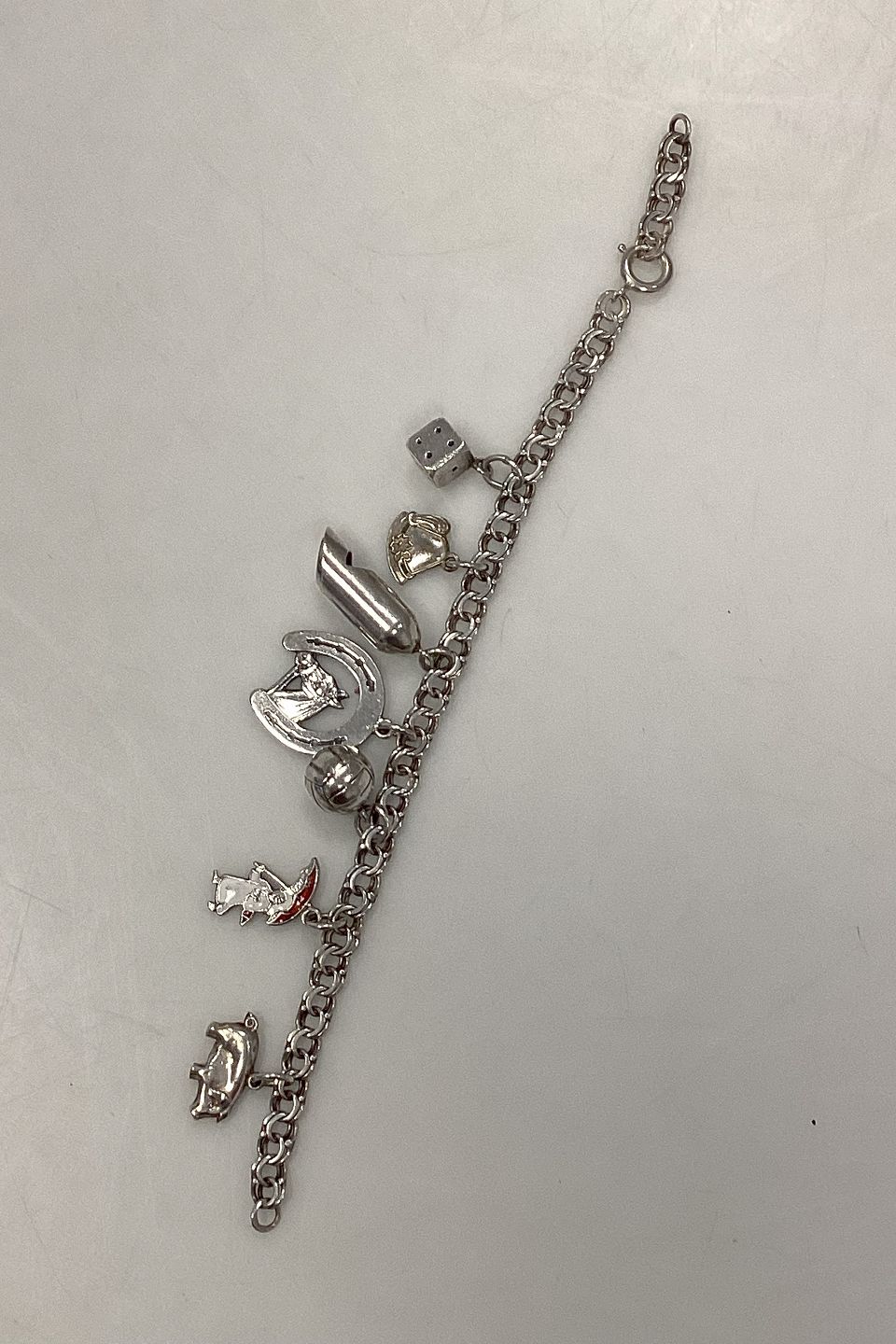 Danish Bismarck bracelet in sterling silver with various pendants, Dice, Alpine hat, Flute, Horseshoe, Ball, Girl with umbrella, and Pig