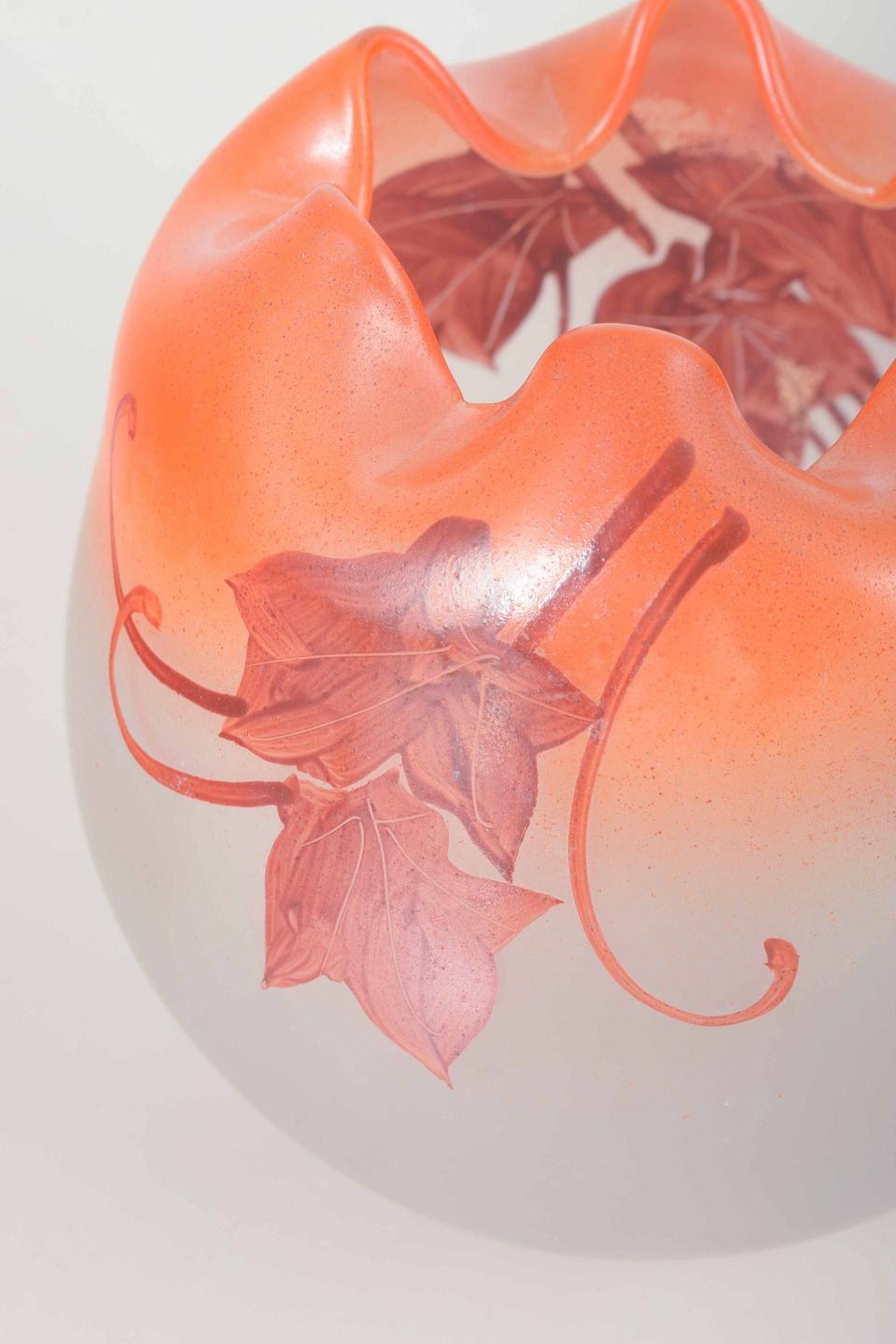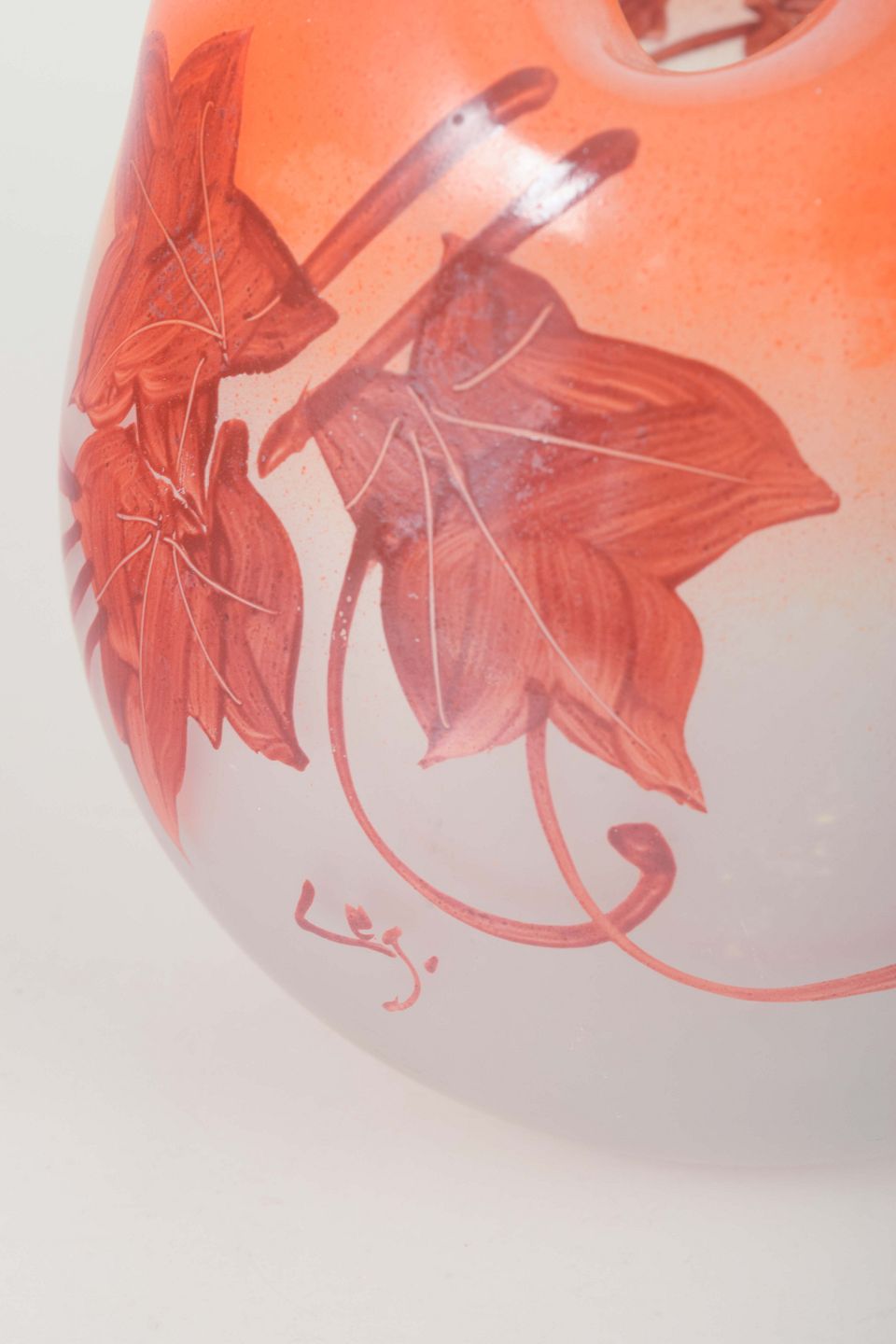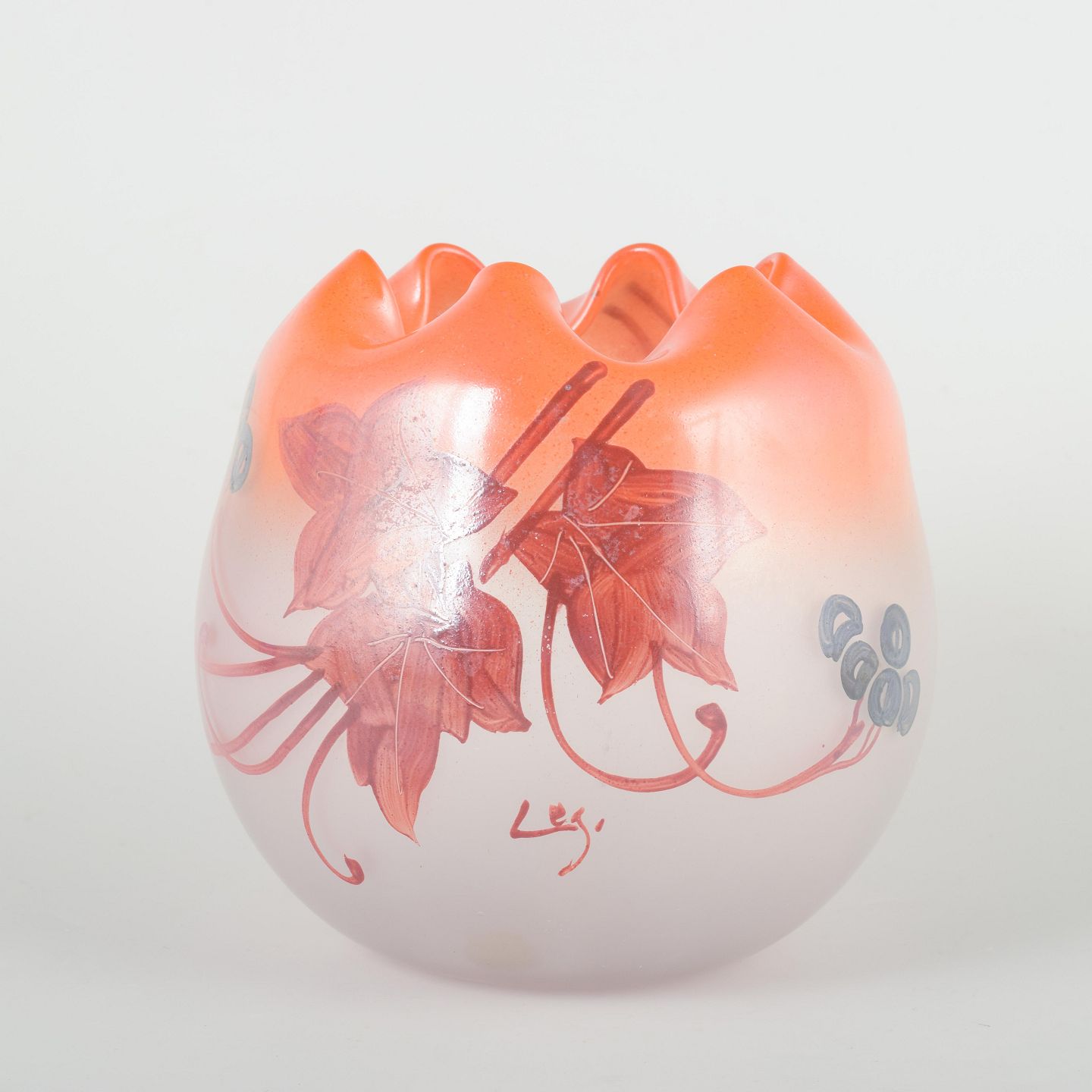 Organically shaped vase in multicolored opalescent glass with hand-painted decoration of red vine leaves and dark berries. The wavy rim enhances the decorative character. Signed “Légras” in the décor.