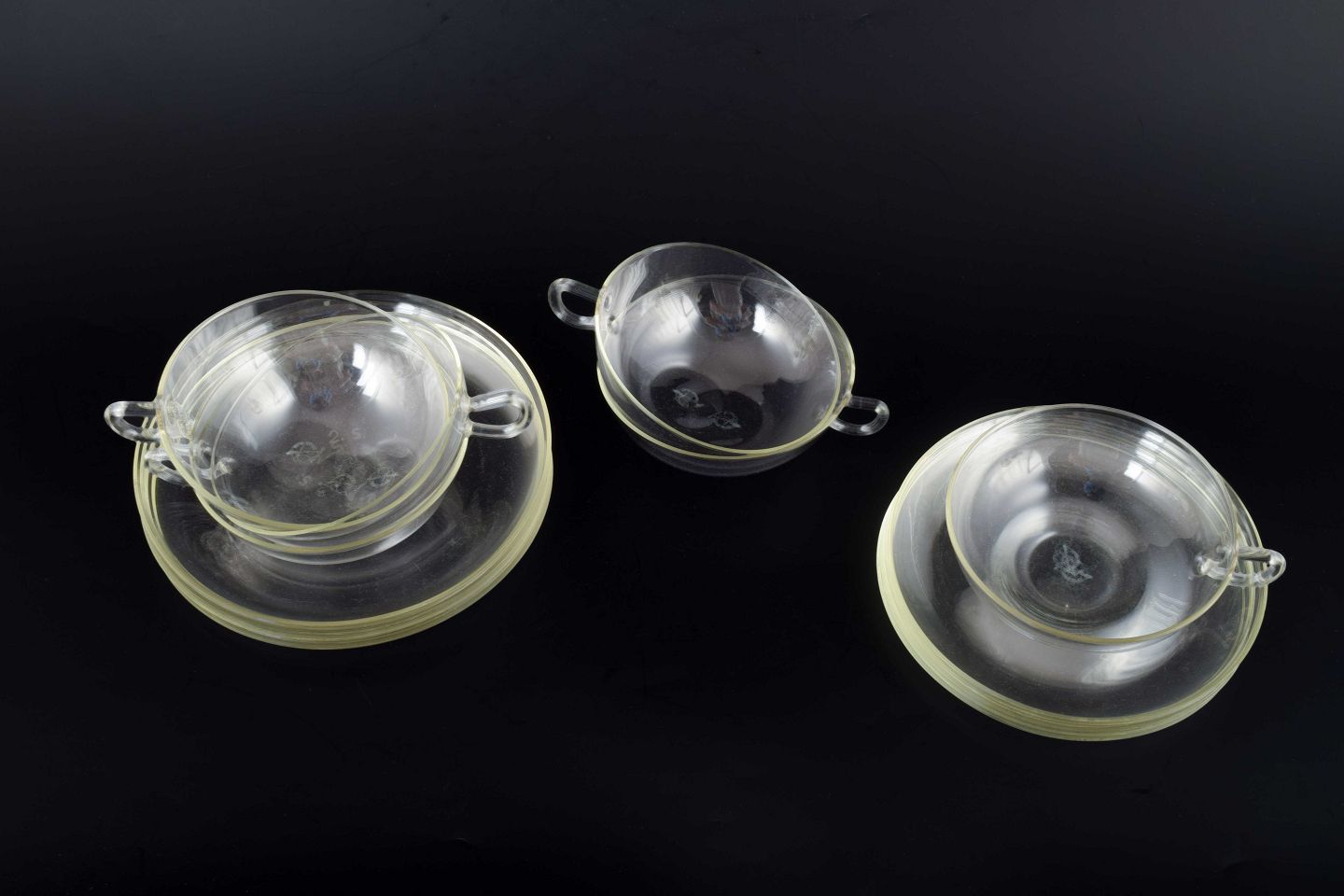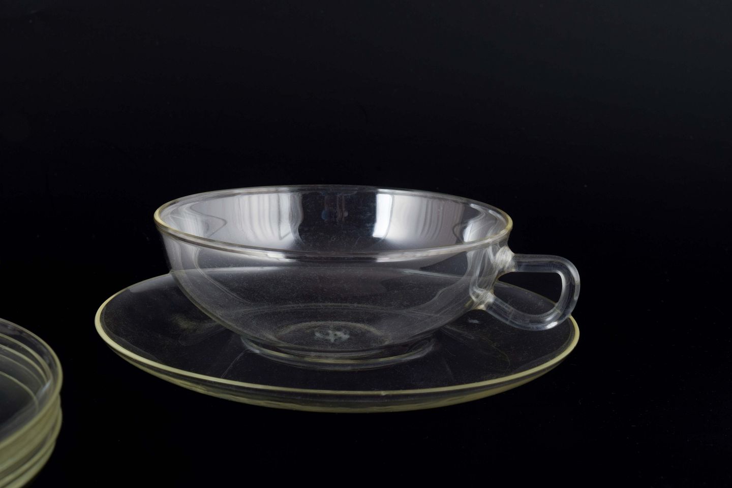Bauhaus-inspired tea set consisting of 6 teacups (H. 4 cm, Ø 13 cm), 6 saucers (Ø 15 cm) and 6 plates (Ø 17 cm). Produced in heat-resistant borosilicate glass (Jenaer Glas).