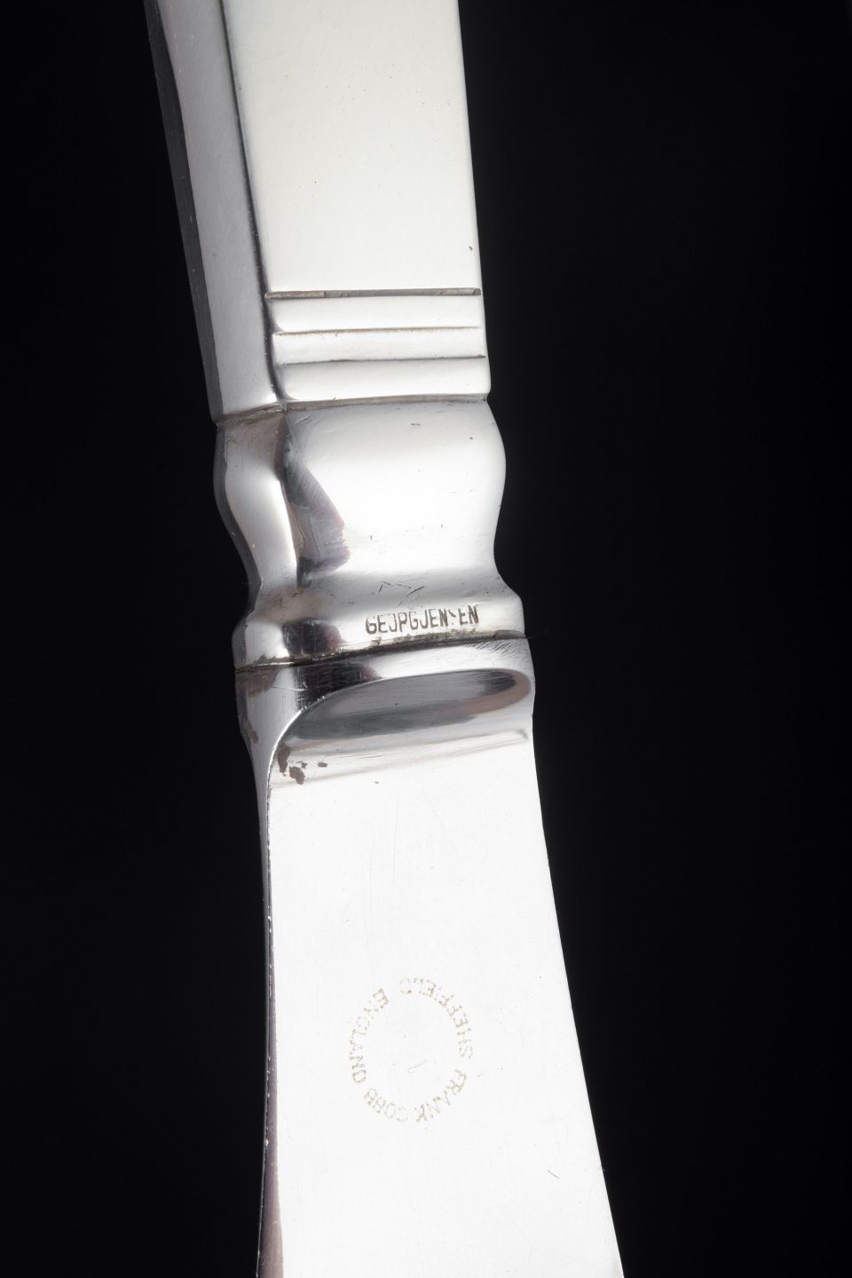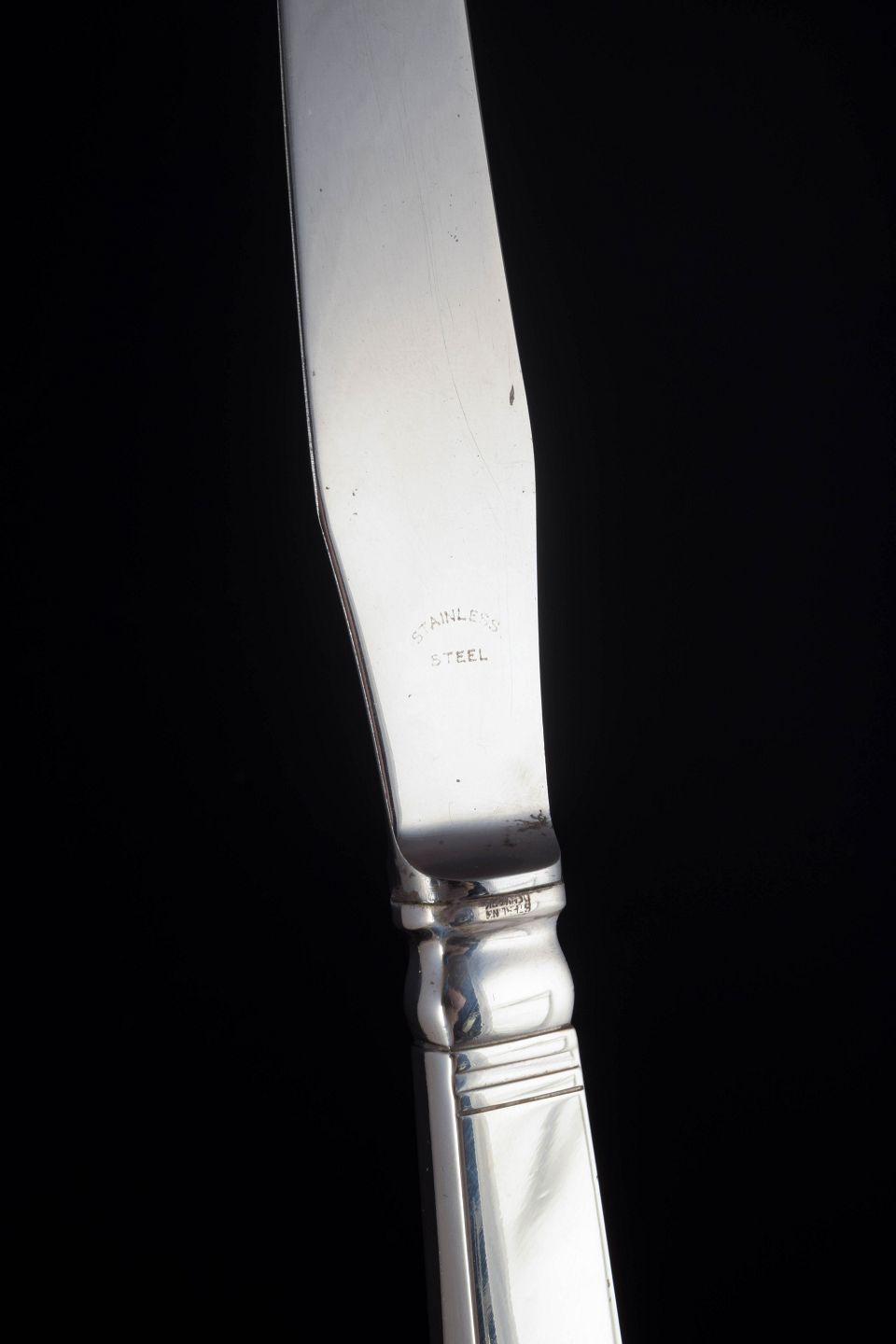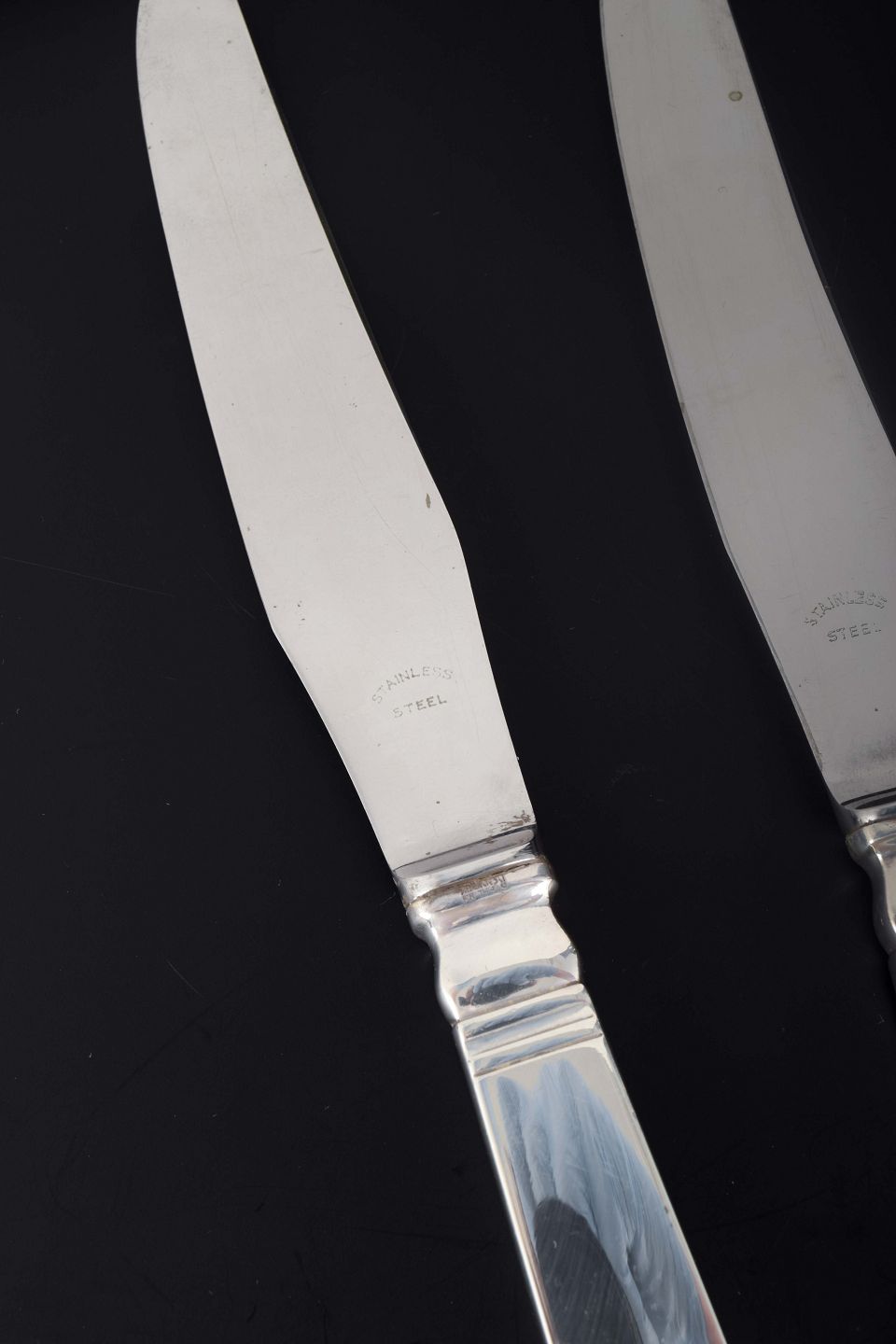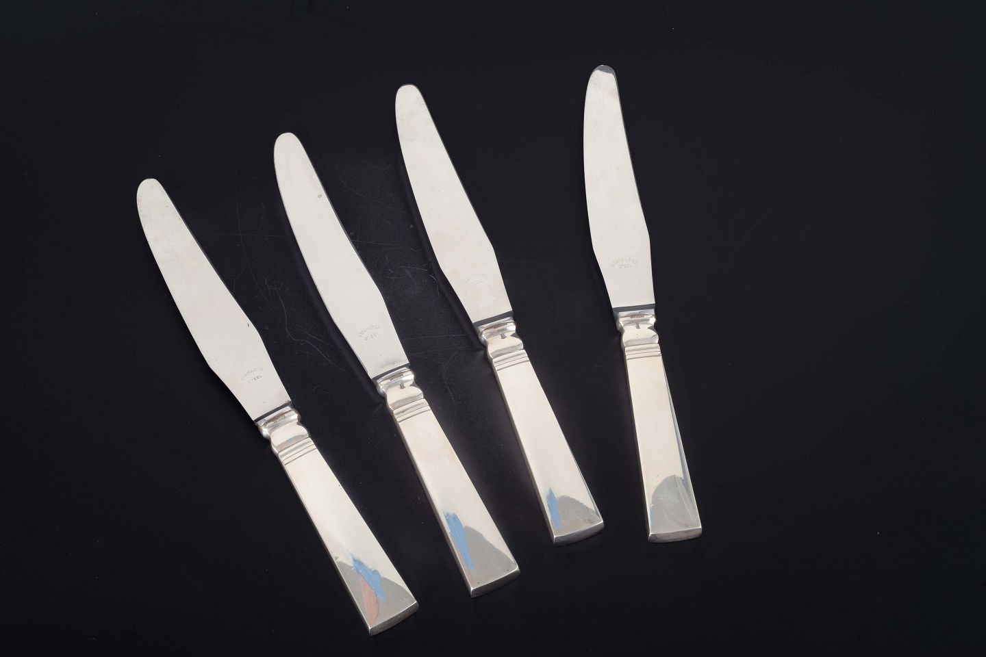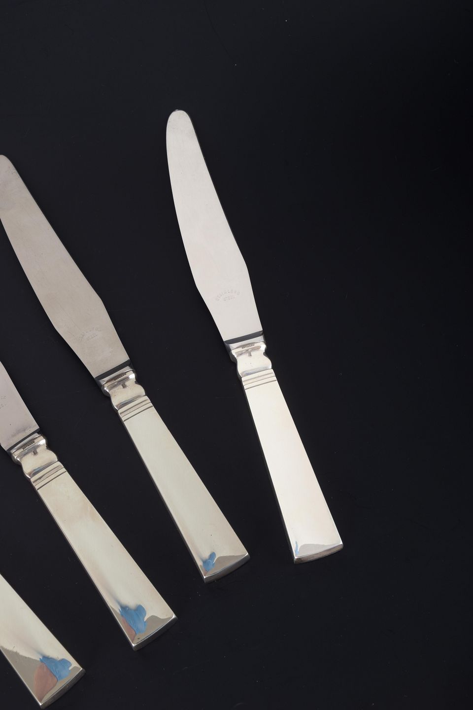 Set of 4 dinner knives in the elegant “Acadia / Blok” pattern, designed by Harald Nielsen in 1918. The knives feature sterling silver handles combined with long stainless steel blades. A classic example of Art Deco style, with functionalist lines and geometric proportions.