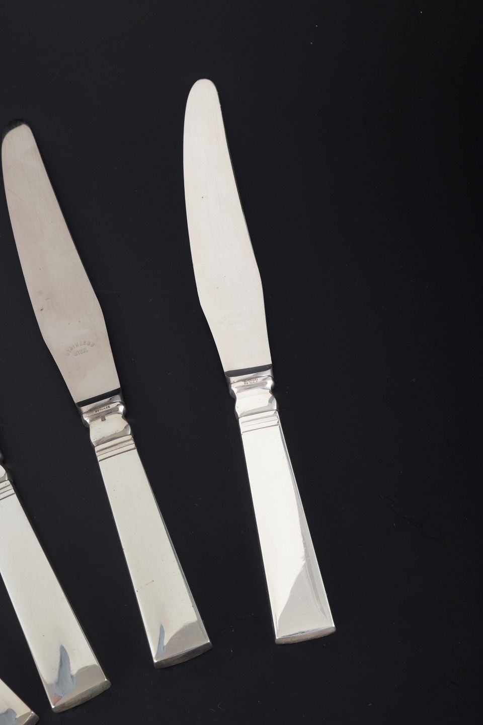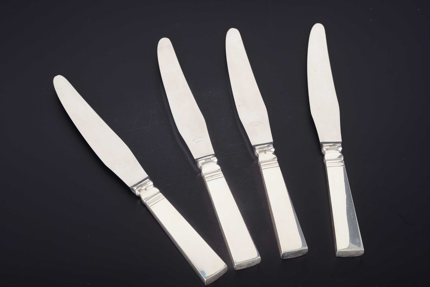 Set of 4 dinner knives in the elegant “Acadia / Blok” pattern, designed by Harald Nielsen in 1918. The knives feature sterling silver handles combined with long stainless steel blades. A classic example of Art Deco style, with functionalist lines and geometric proportions.
