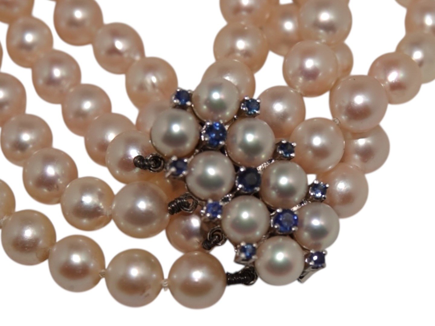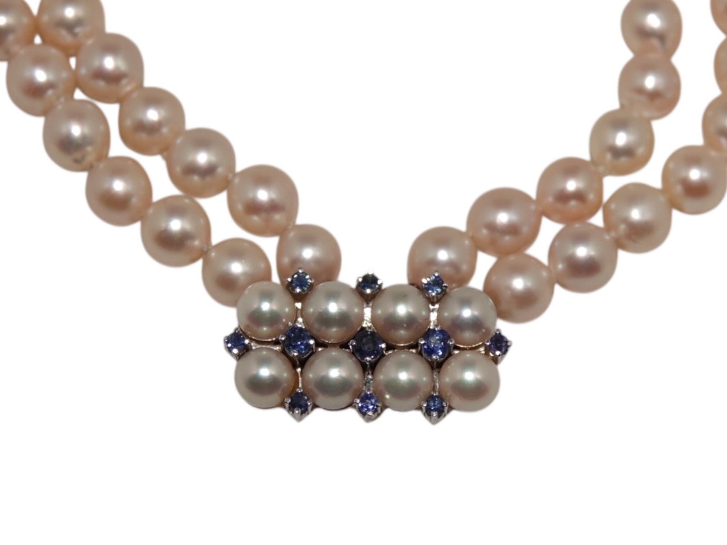 Double row pink Akoya pearl bracelet with 14 carat white gold pendant with sapphires.