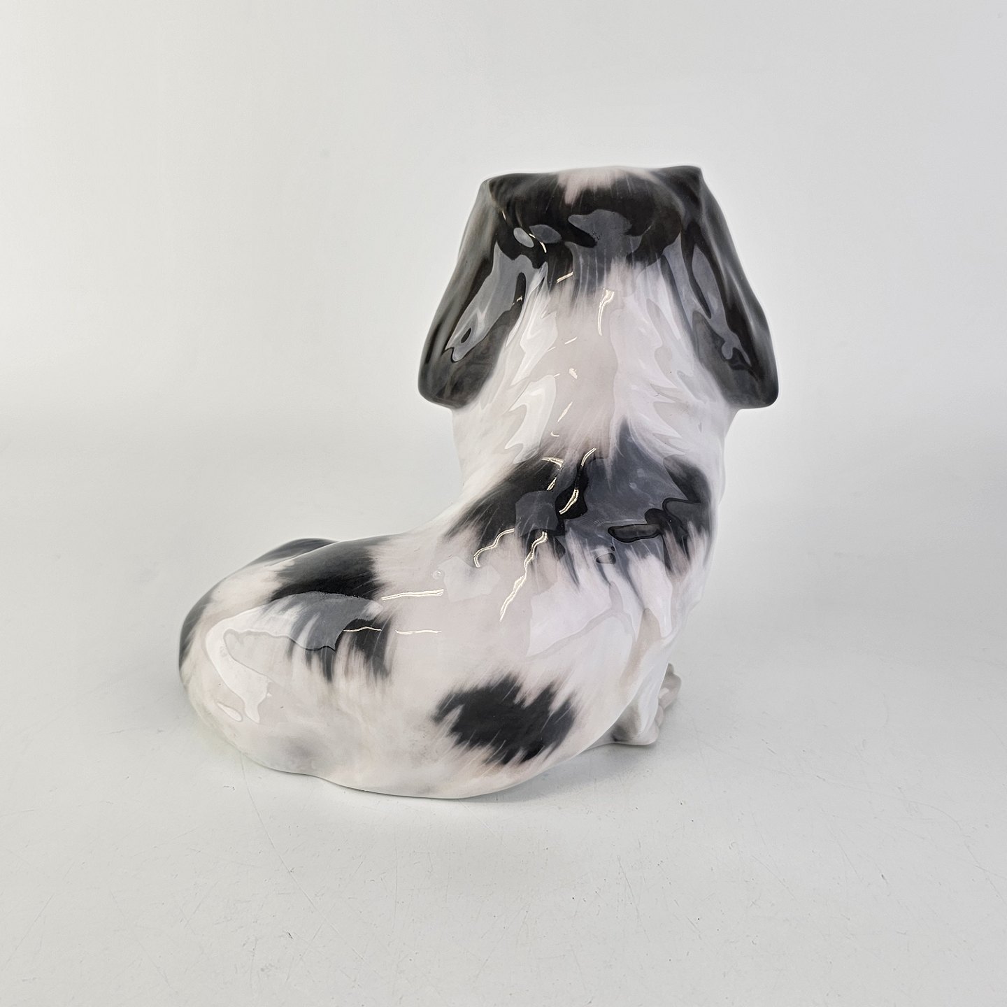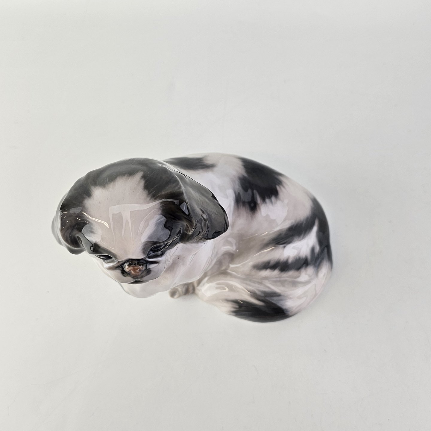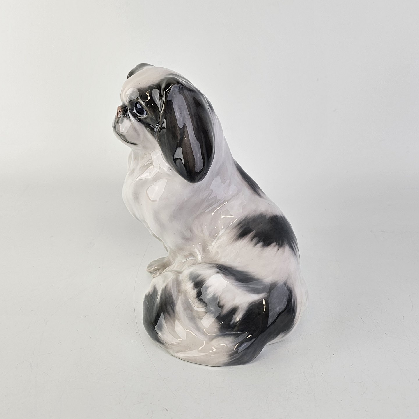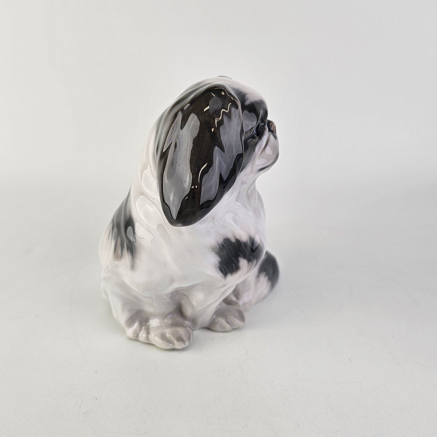 Figur i porcelæn med motiv af en pekingeser hund som sidder ned
