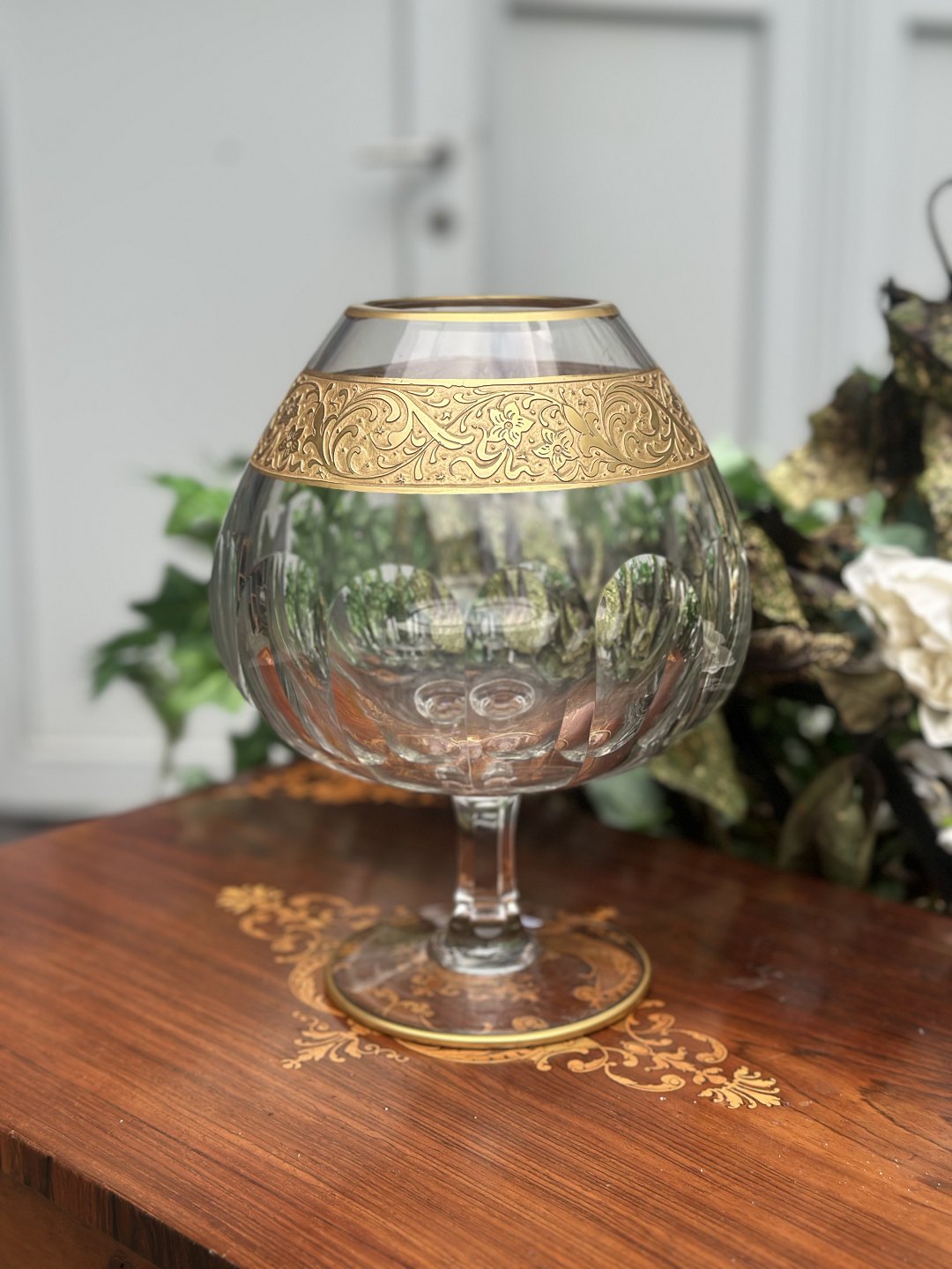 Moser glass goblet crystal, very high quality from the mid-1900s, wide band of gilded 24k gold enamel with engraved flowers in classic baroque H 18 cm W 10 cm