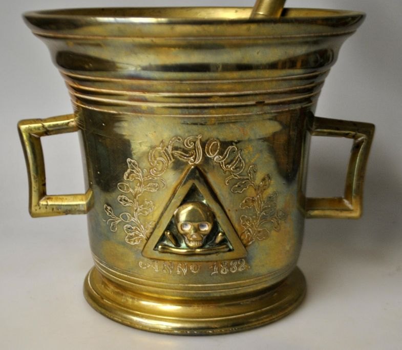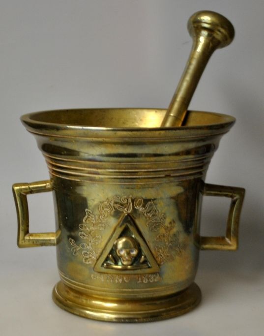 Large brass pharmacist mortar from Svane Apoteket in Randers, 1882. Denmark. With pestle. The side is decorated with a triangle, in which there is a skull with crossed bones. With engraved decoration and the name: Skjold anno. 1882. Height.: 15 cm. Dia opening: 17 cm. Length pestle: 25.5 cm.