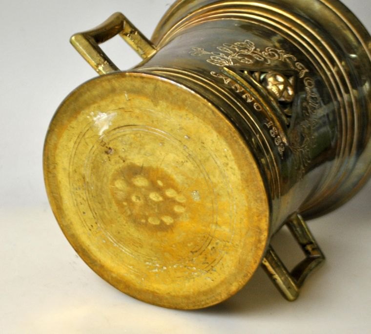Large brass pharmacist mortar from Svane Apoteket in Randers, 1882. Denmark.