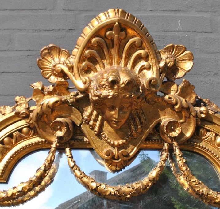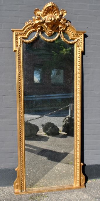 Large Danish antique gilded mirror, approx. 1870. With edge decorations. Top with tendrils and a woman's face. H.: 220 cm. W.: 85 cm.