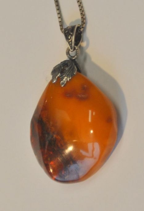 Amber necklace, N.E From, Nakskov (after 1944), Denmark. Polished amber. Sterling silver pendant with foliage and flowers. Sterling chain, length: 42 cm. From GIFA.