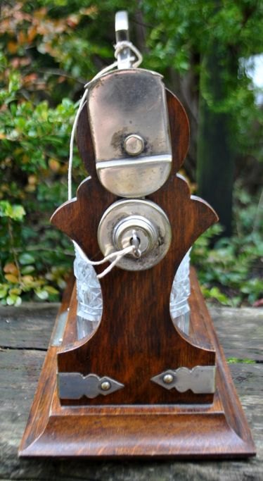 Tantalus of oak with three crystal decanters with stoppers. England. 19th century.