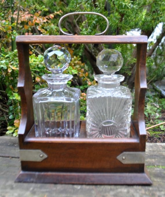 Tantalus of oak with two different crystal decanters with stoppers. England. 19th century
