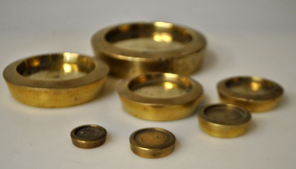 Collection of English brass weights, 19th century. Total of 7 pieces. 1/2 Oz, 1 oz, 2 oz, 4 oz, 8 oz, 1 lb and 2 lb. Dia. largest weight: 9.5 cm.