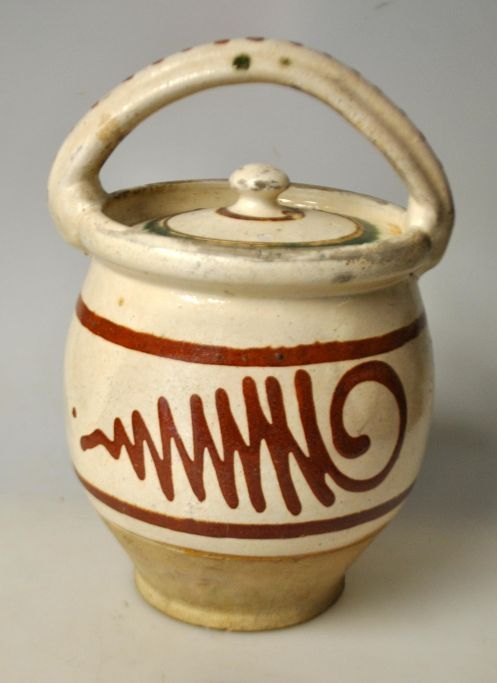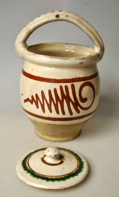 Antique Danish maternity pot in glazed red clay, 19th century. With white underglaze and red and green overglazes. H.: 21 cm.