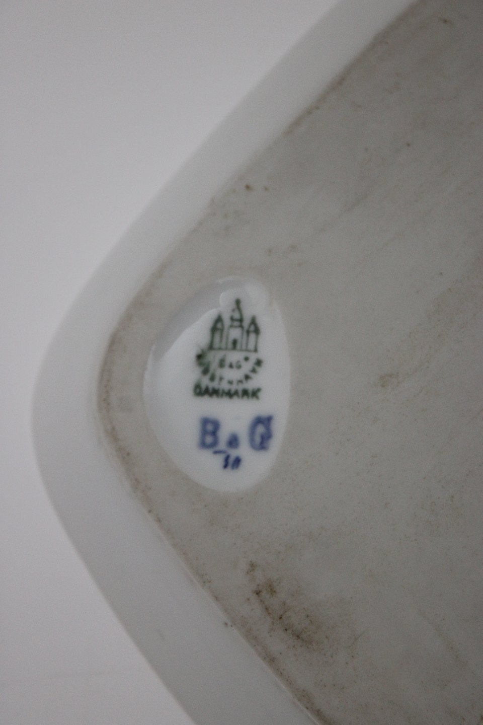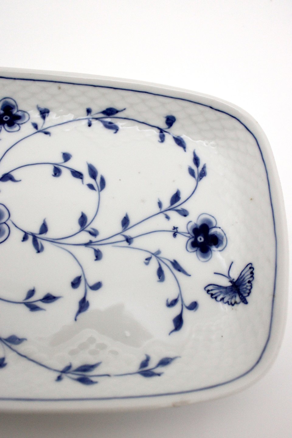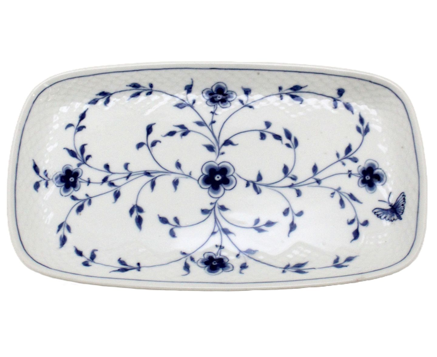 Text available in Danish: Bing & Grøndahl, Sommerfugl, Bakke til sukker og fløde. Højde 2 cm. Længde 27 cm. Bredde 15,5 cm. Produceret i perioden 1915-1948. I. sortering. Fin stand. Pris: 475 kr. stk. Lager: 1