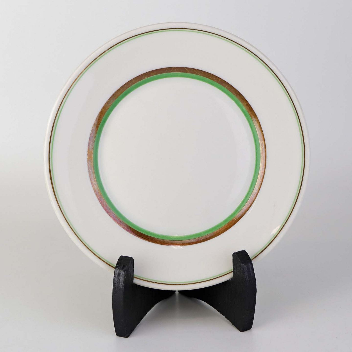 Service i glat hvidt porcelæn med dekoration i grøn og gylden streg.