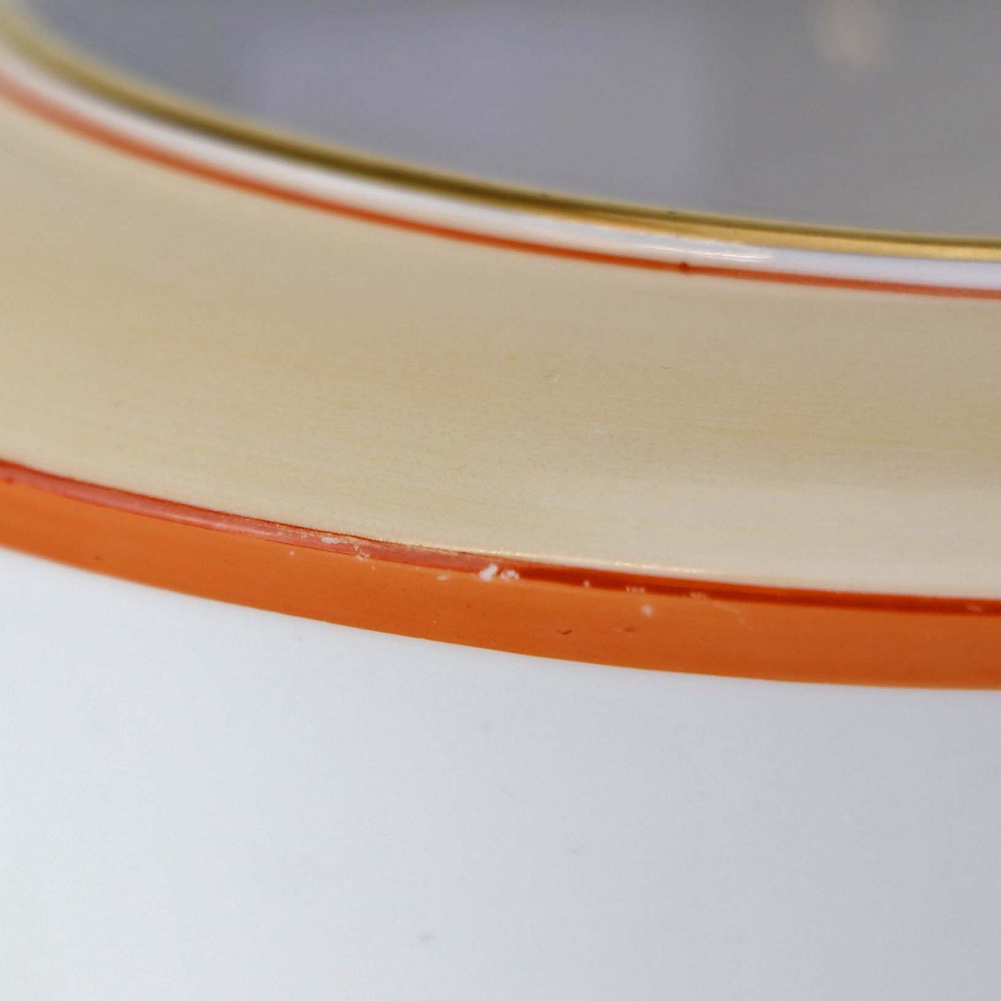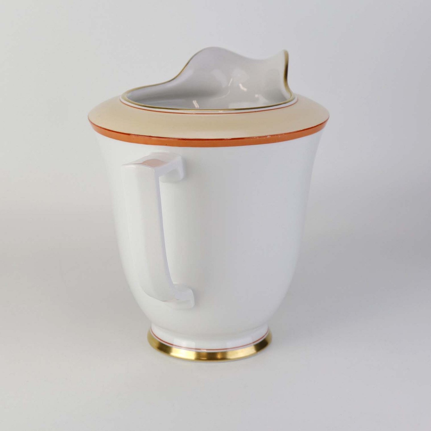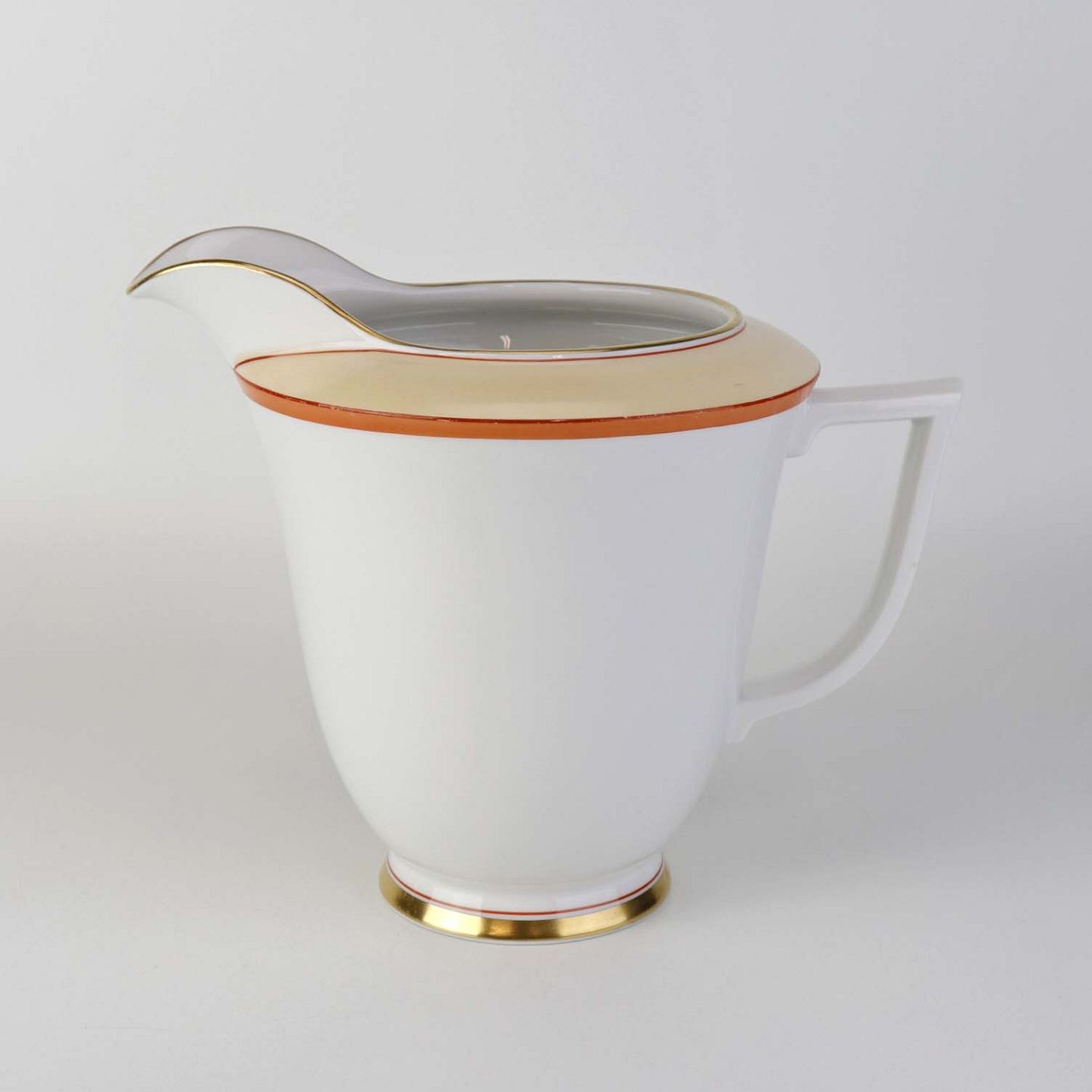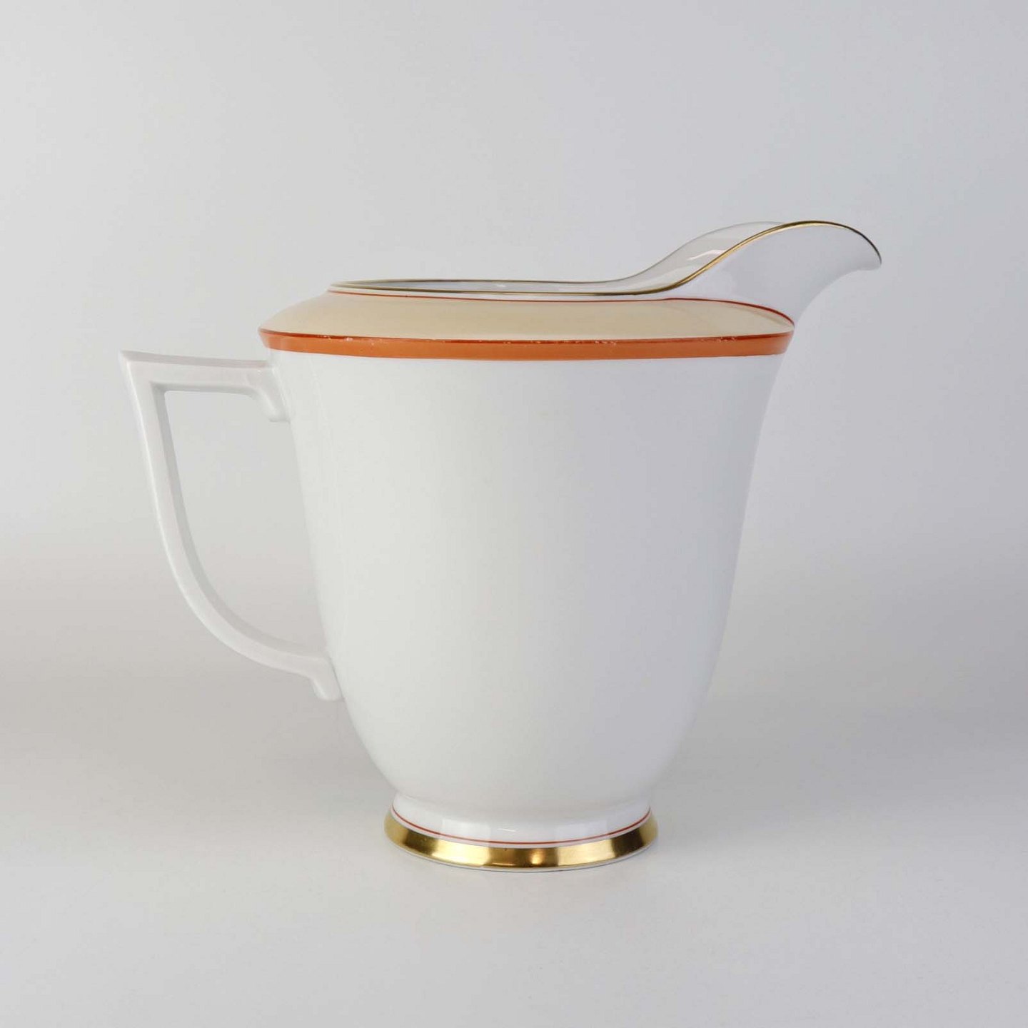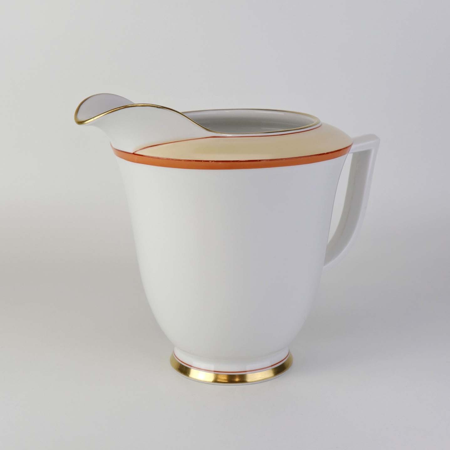 Service i glat hvidt porcelæn pyntet med dekoration i beige, brændt orange og gylden streg.