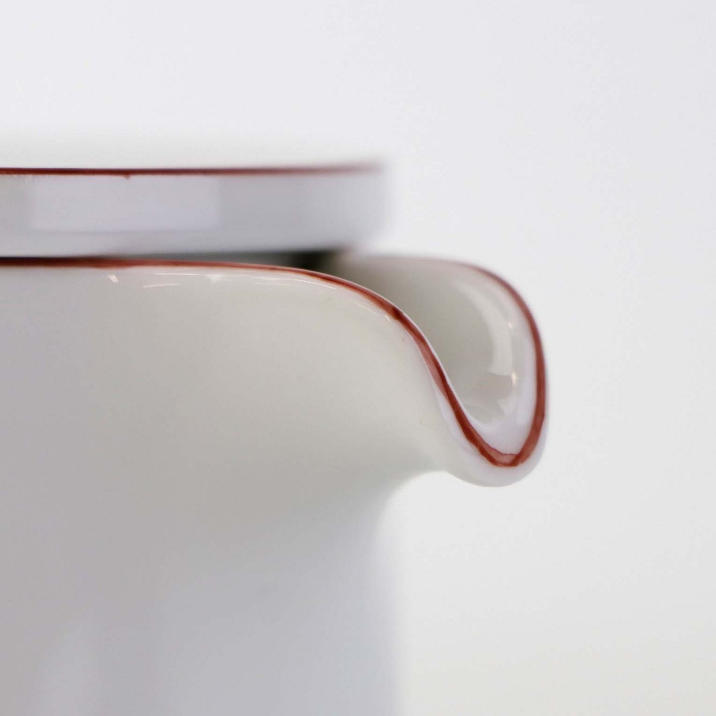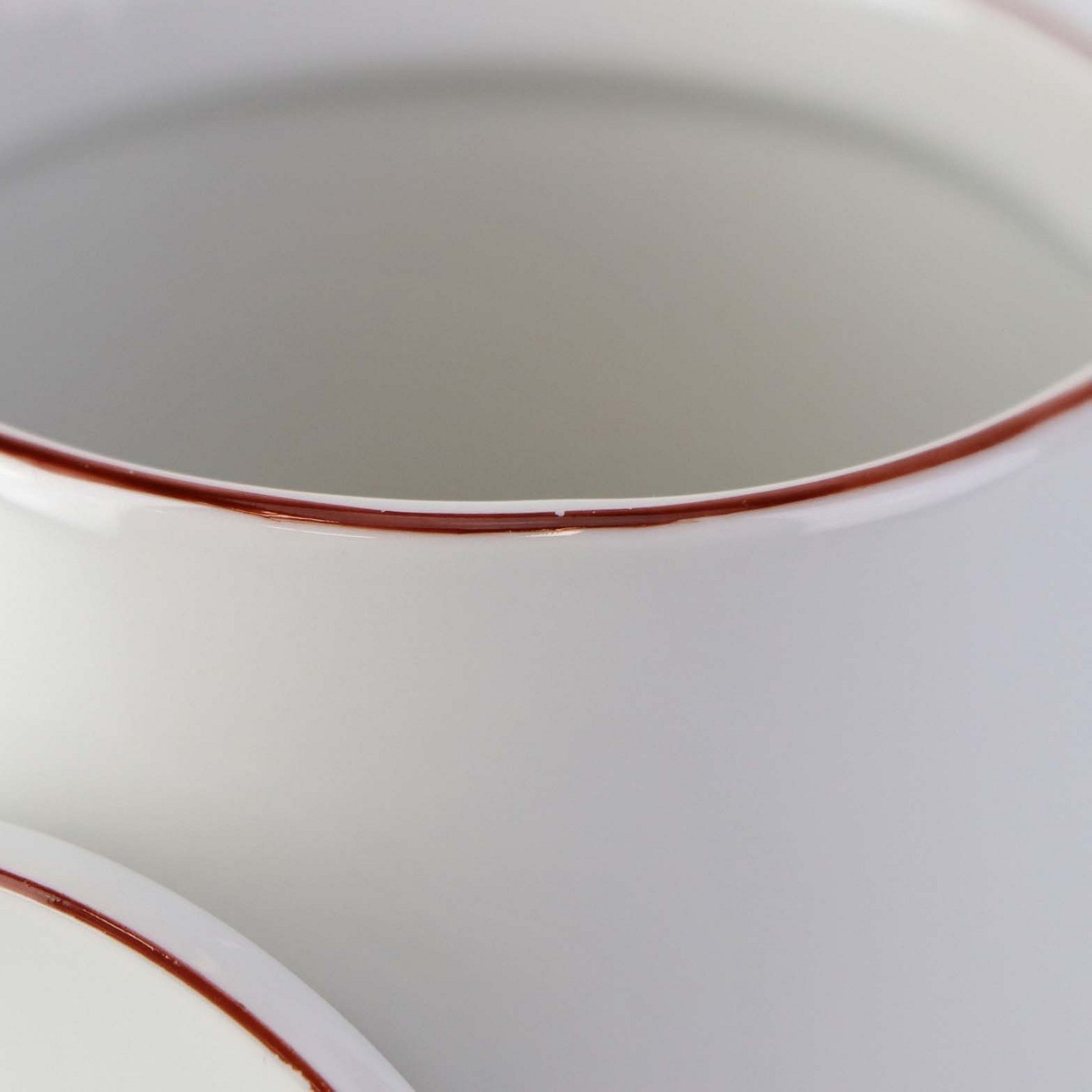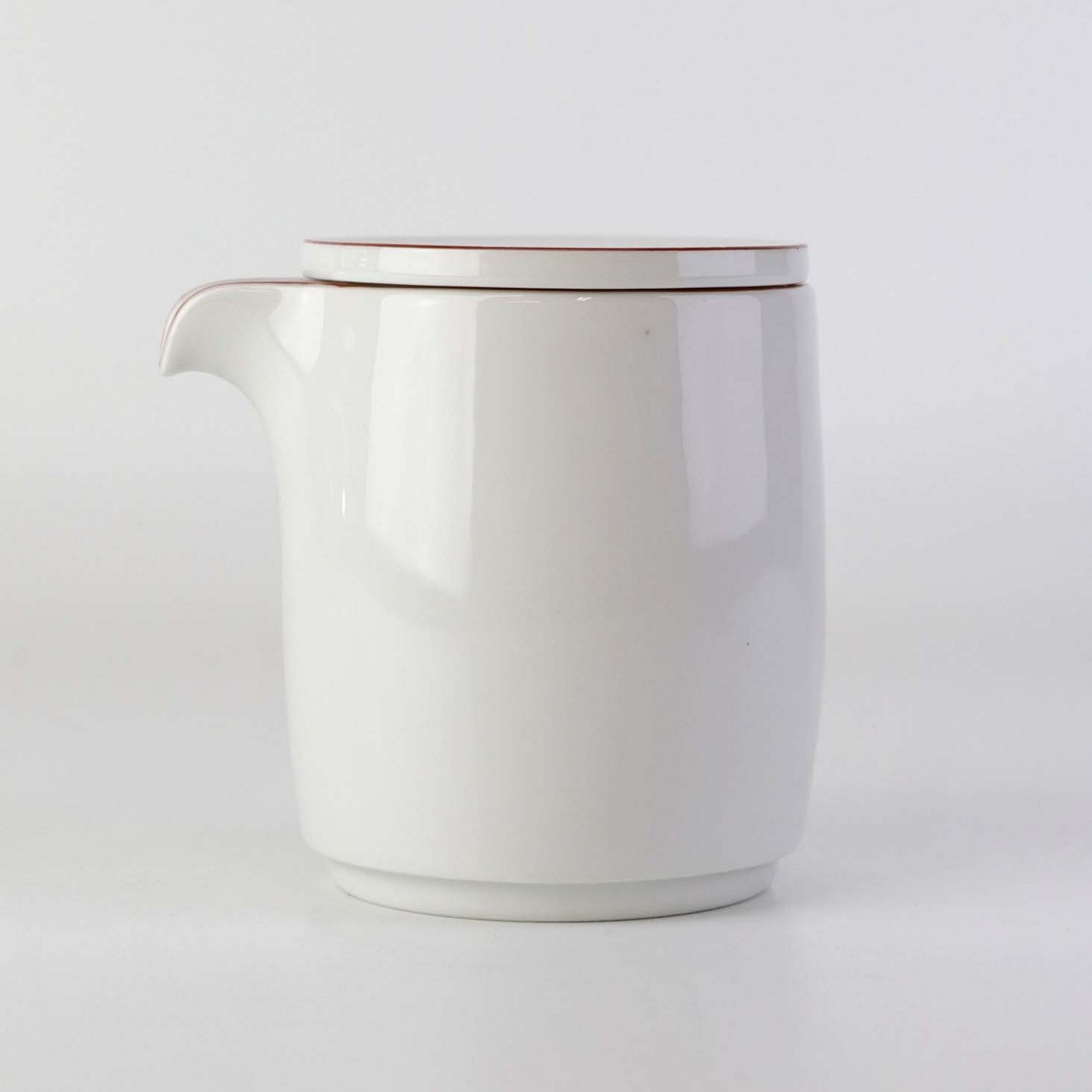 Service i glat hvidt porcelæn med dekoration i tynd rød streg.