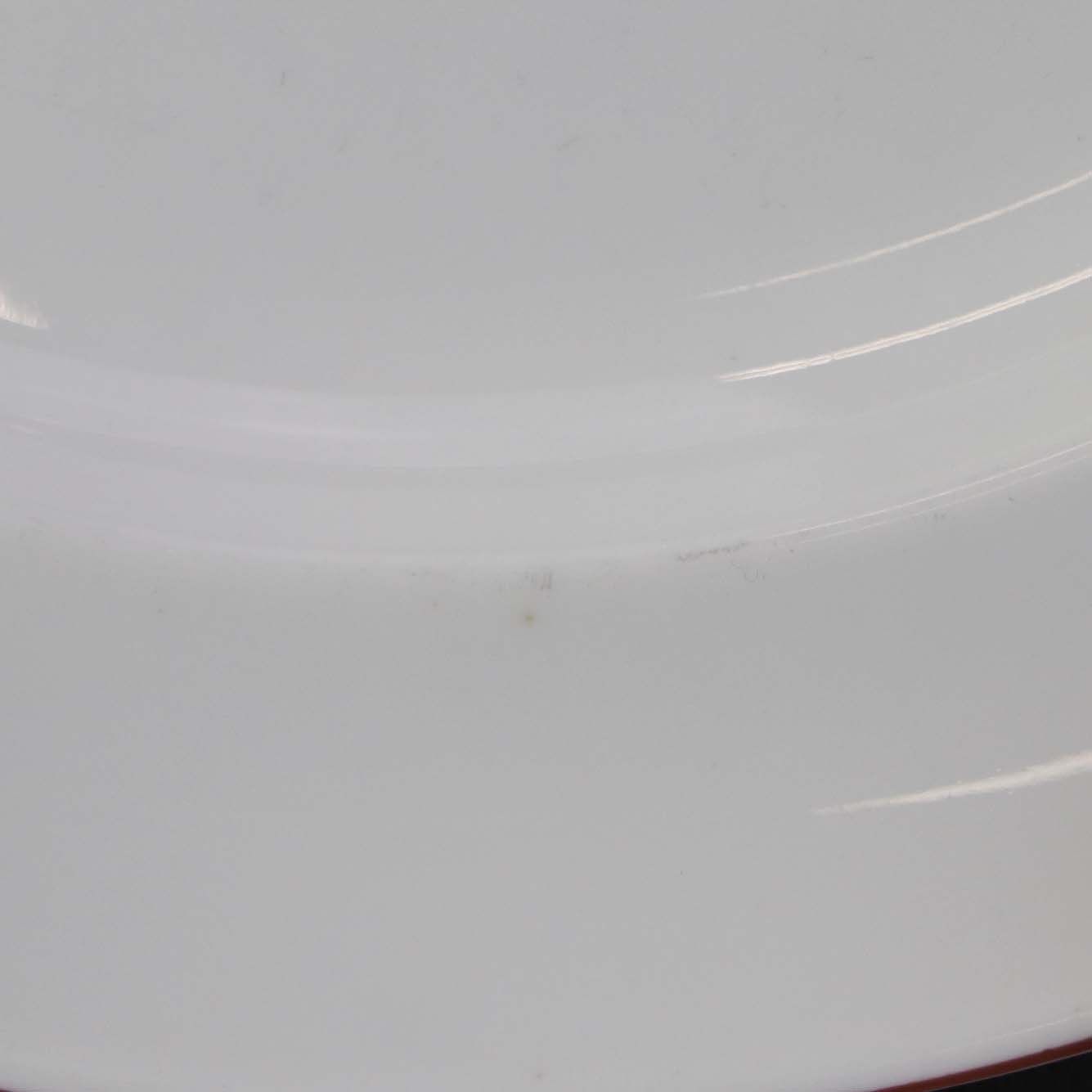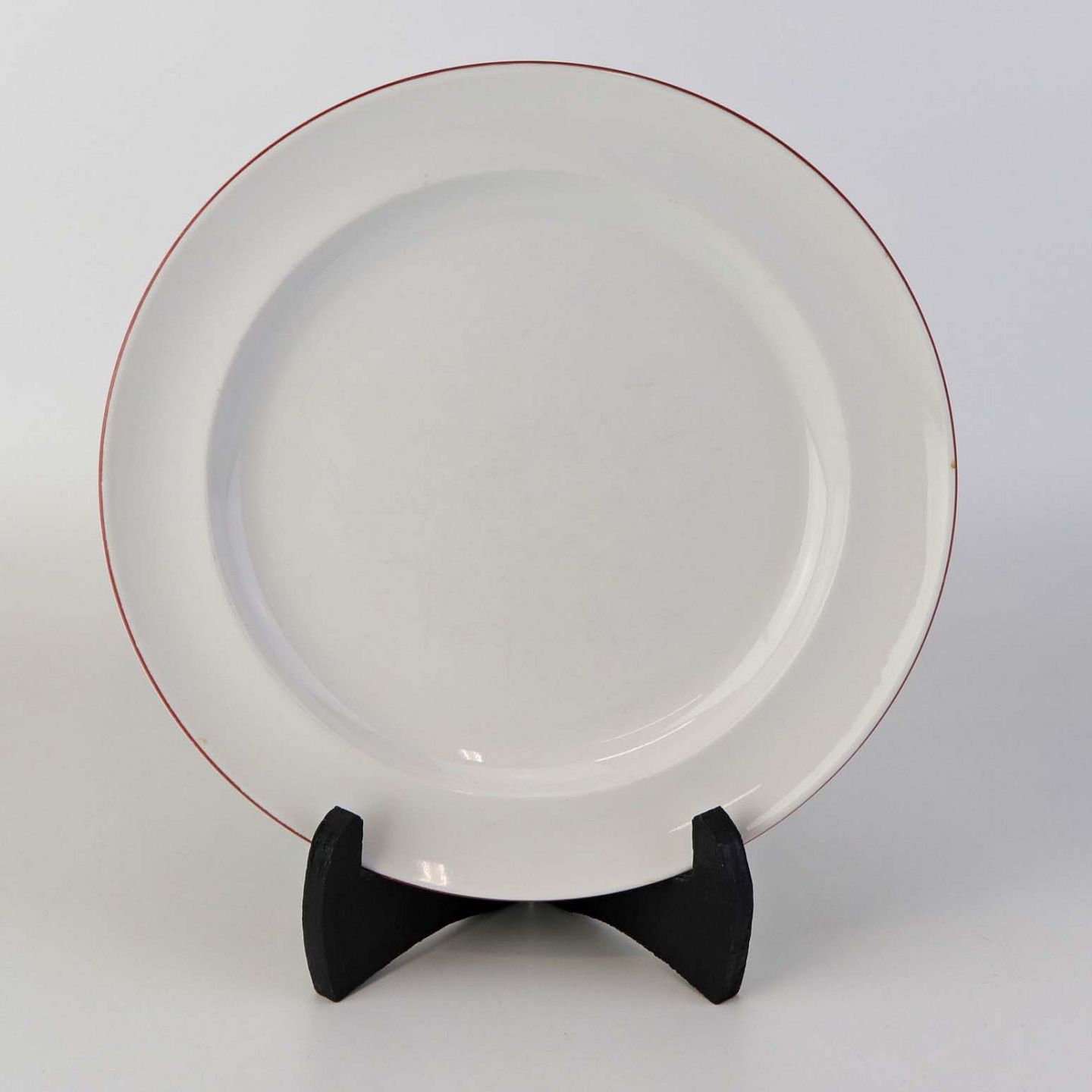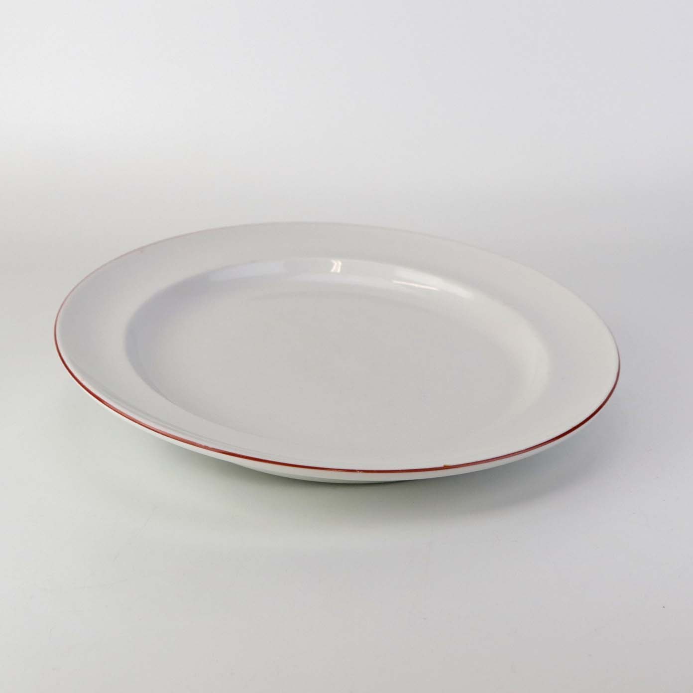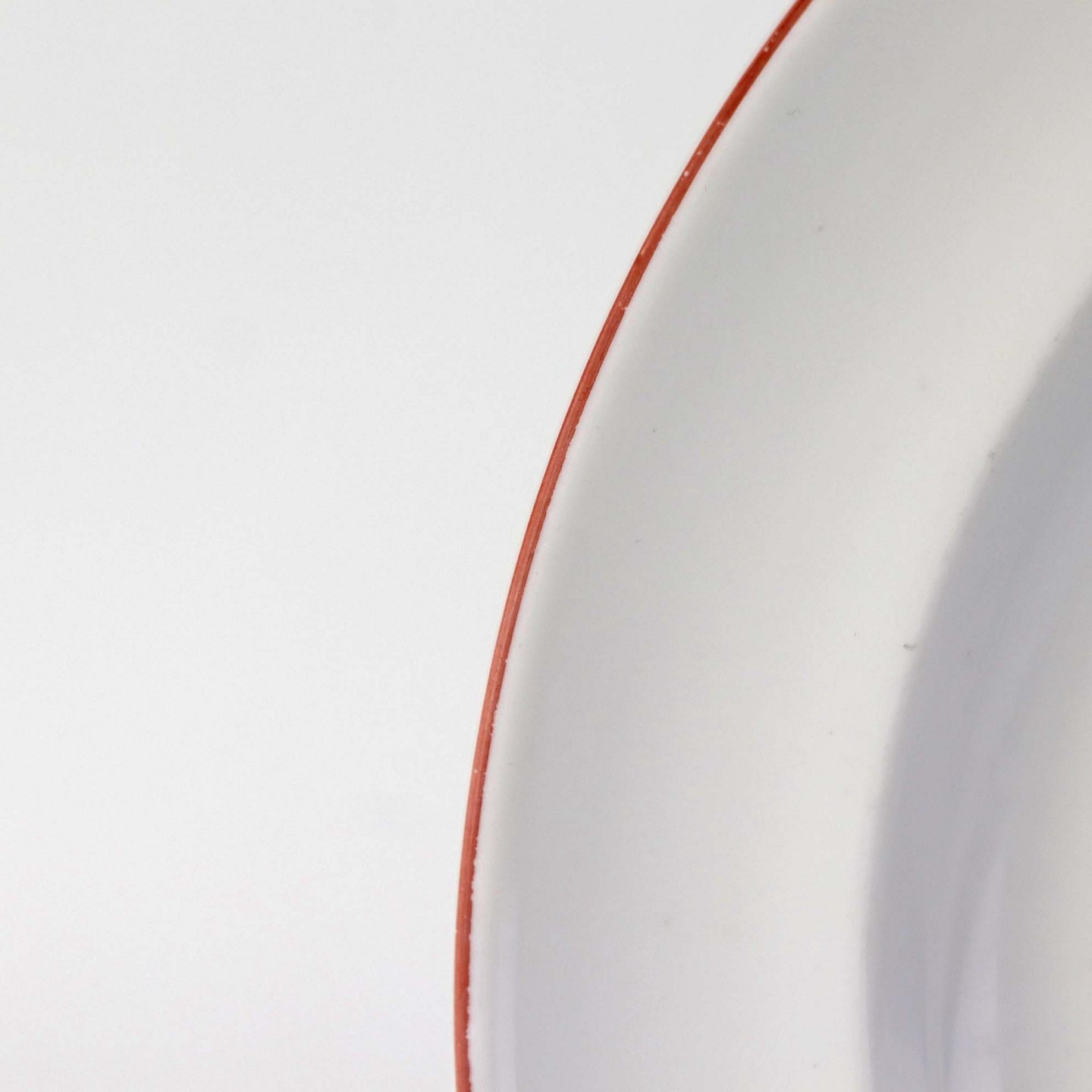 Service i glat hvidt porcelæn med dekoration i tynd rød streg.