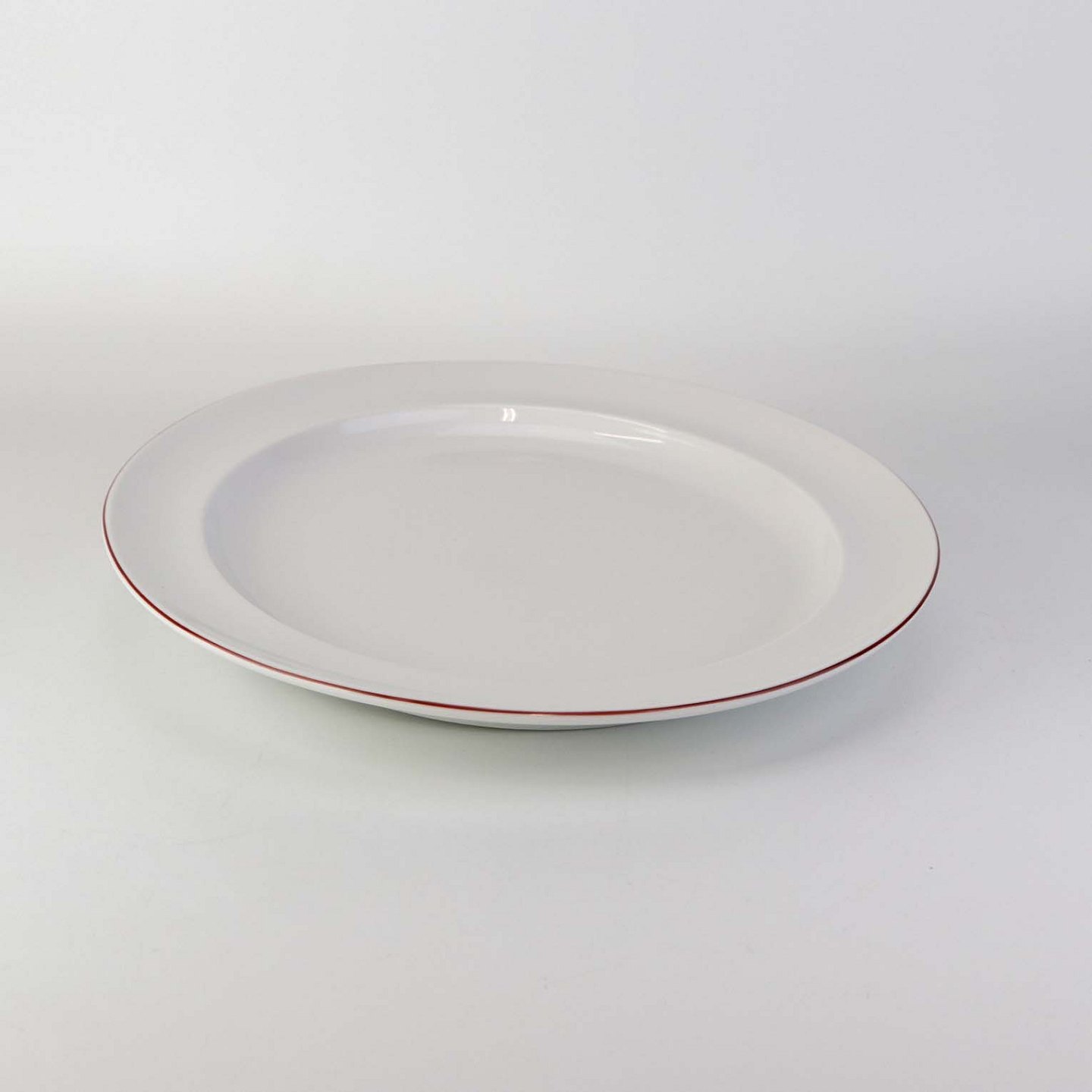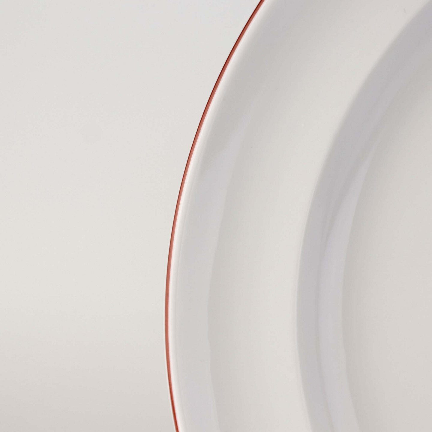 Service i glat hvidt porcelæn med dekoration i tynd rød streg.