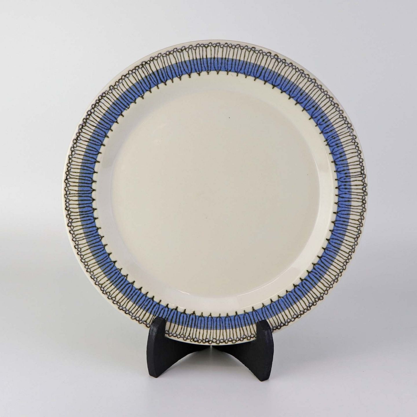 Service i lys fajance dekoreret med abstrakt mønster i sort streg over blå bort.