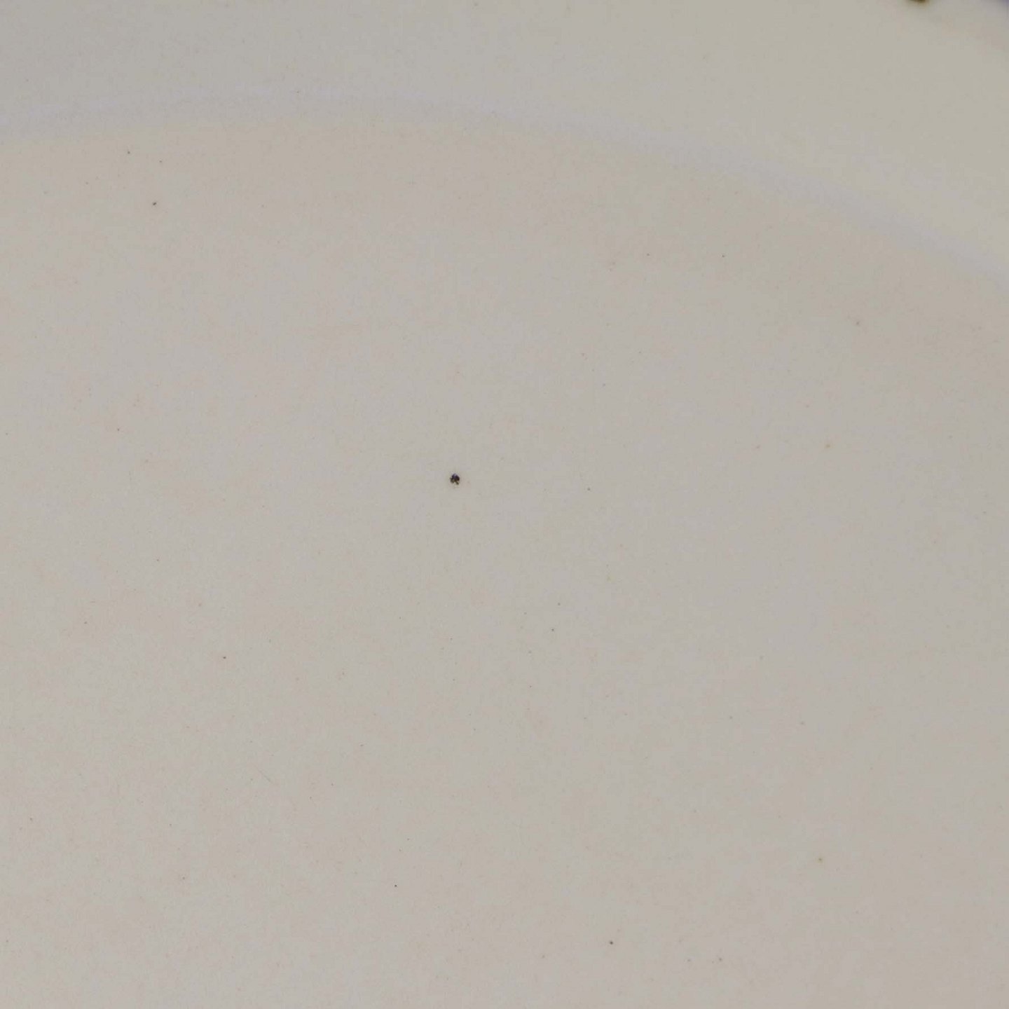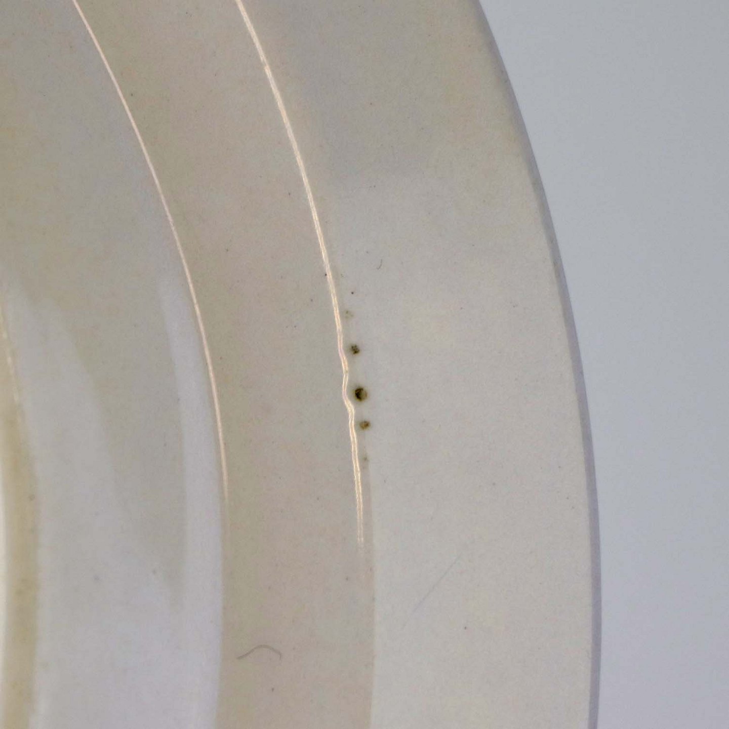 Fremstår med enkelte mindre mørke pletter under glasuren.