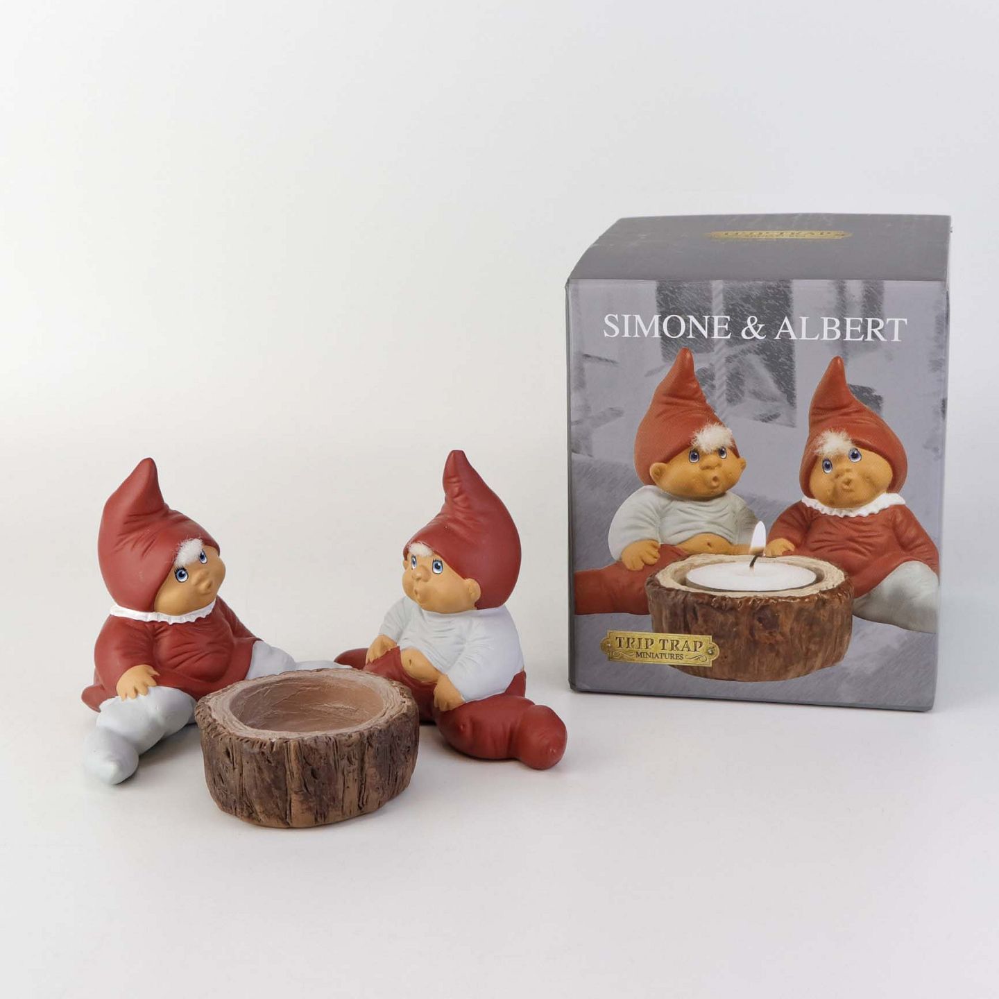Figursæt med motiv af nisserne Simone og Albert med tilhørende fyrfadsstage fra serien Klarborg jul år 2021. Figurene kommer med original boks.
