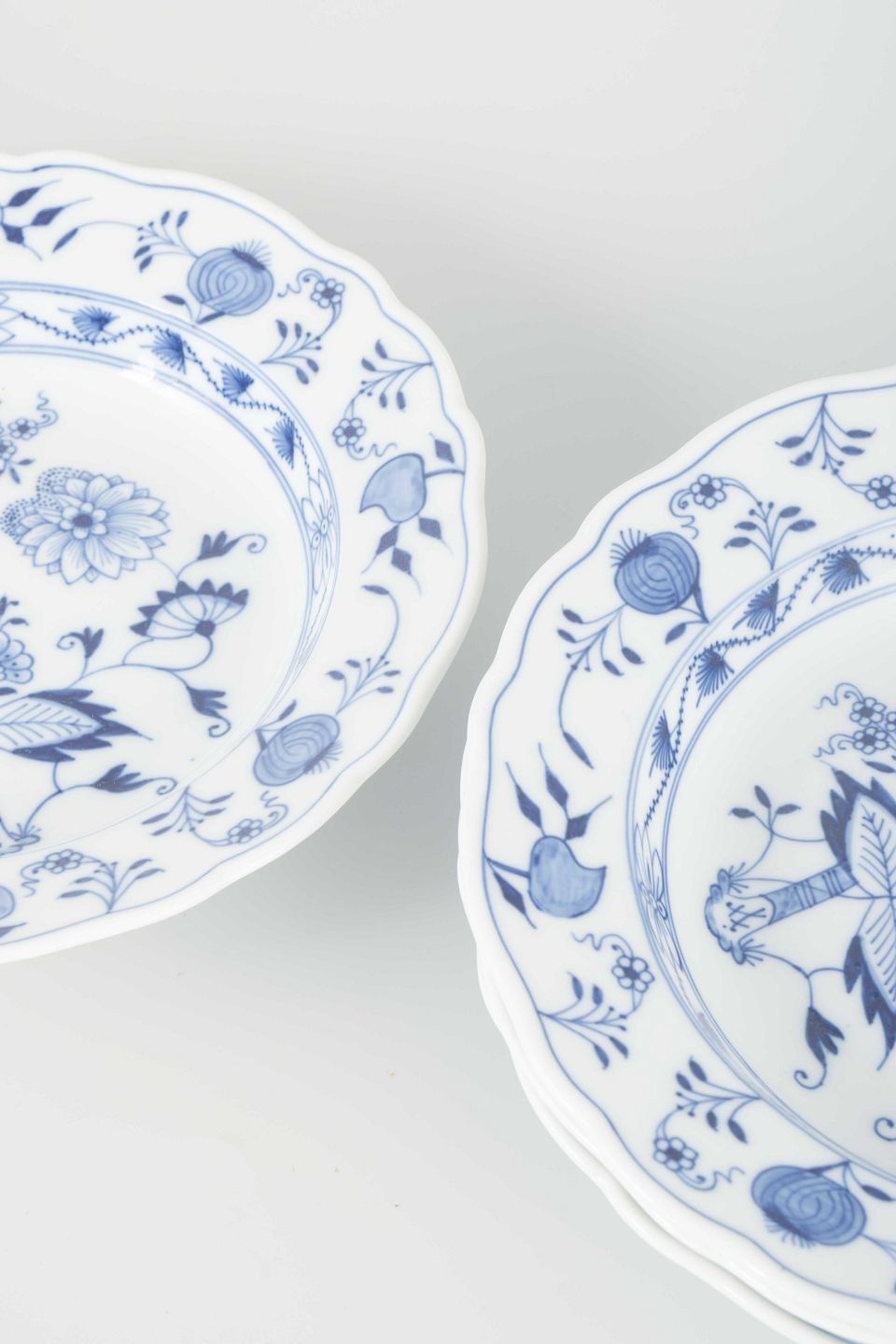 Four hand-painted porcelain soup plates with underglaze blue “Blue Onion” decoration, scalloped rims and refined floral detailing.