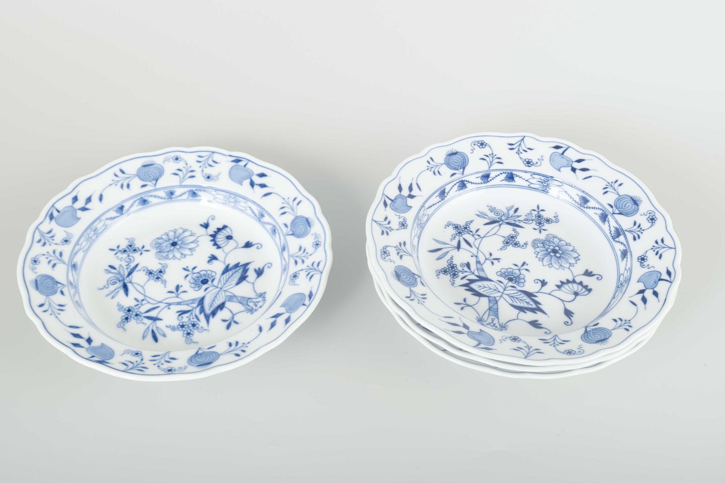 Four hand-painted porcelain soup plates with underglaze blue “Blue Onion” decoration, scalloped rims and refined floral detailing.