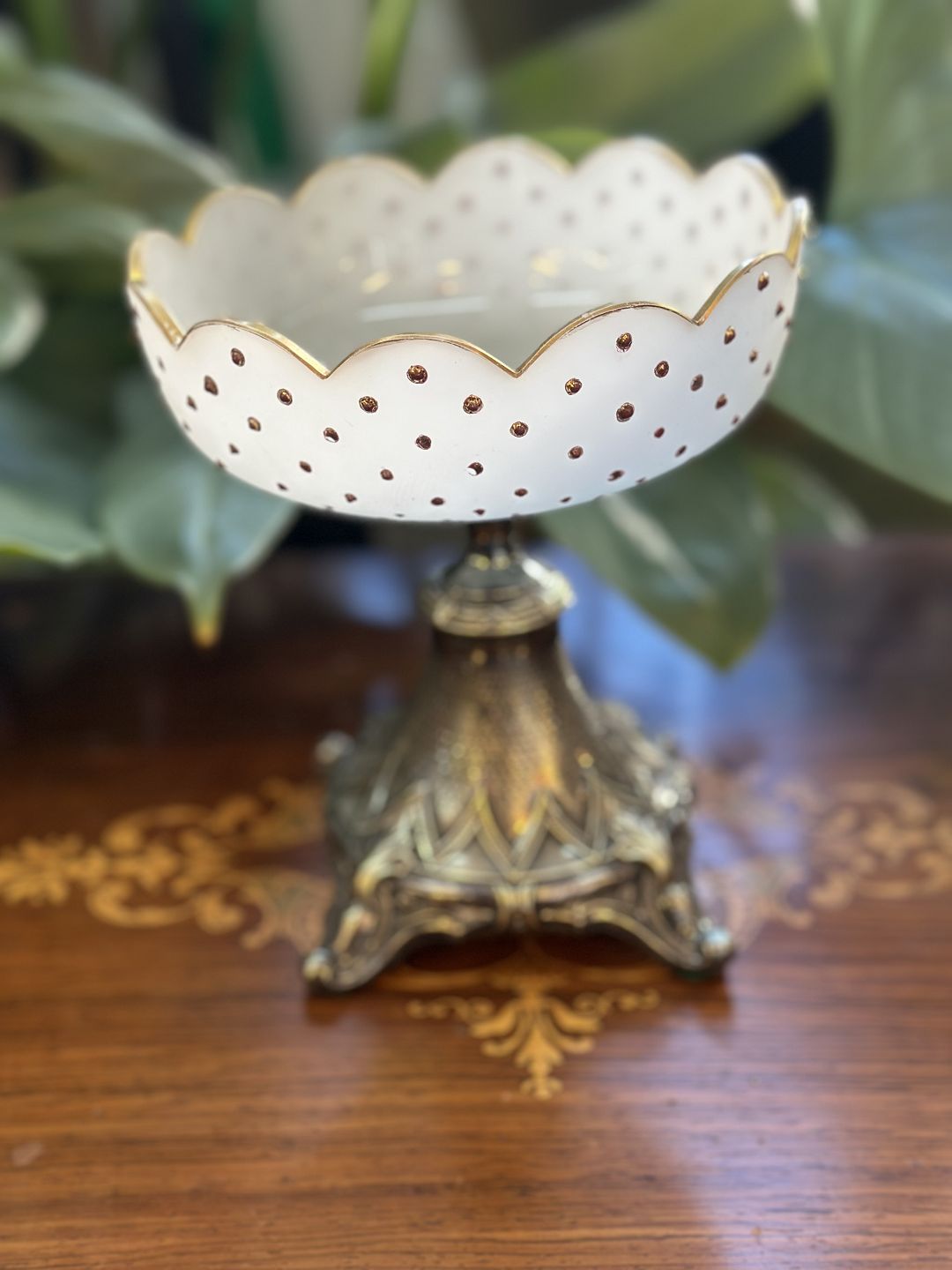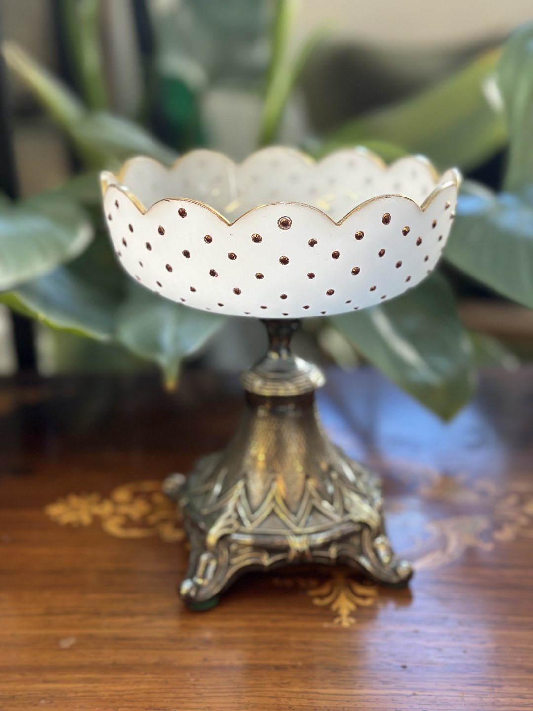 Vintage bowl from the 1800s -1900s, the bowl is in opaline glass (milky white glass) with hand-painted golden dots and gold rim, the foot is in silver plated with decorative art nouveau - baroque inspired details, designed opaline glass from the late 1800