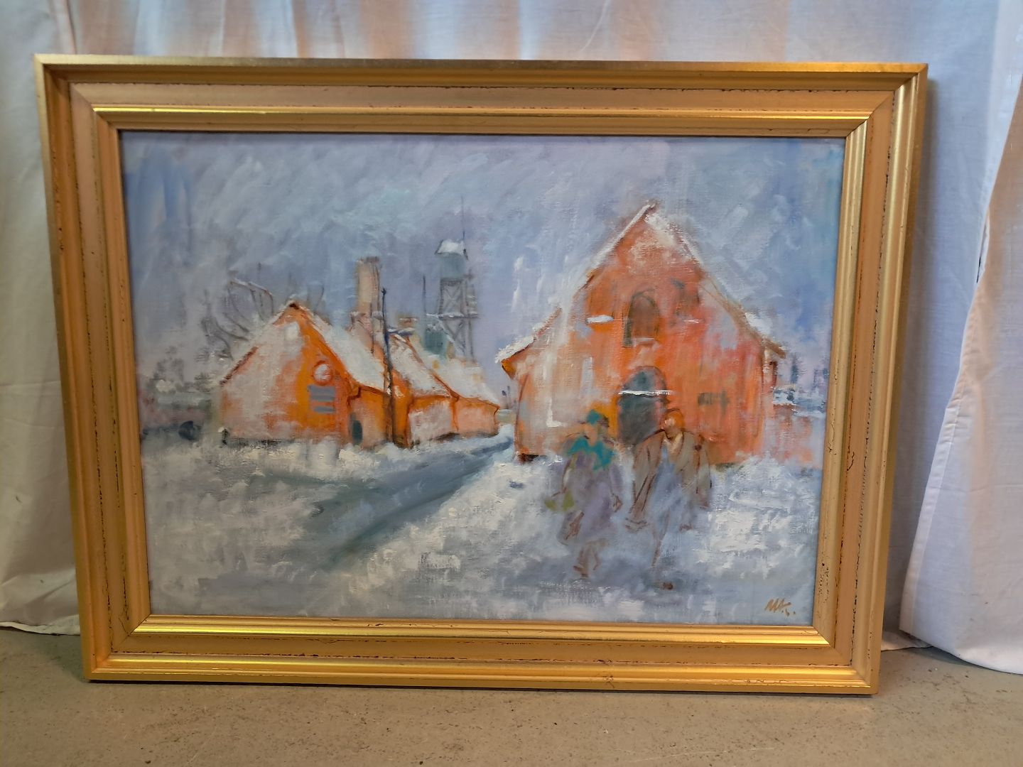 Maleri af Dragør Havn i guldmalet ramme, af : Mogens Amdi Thorsen (1924-2016)