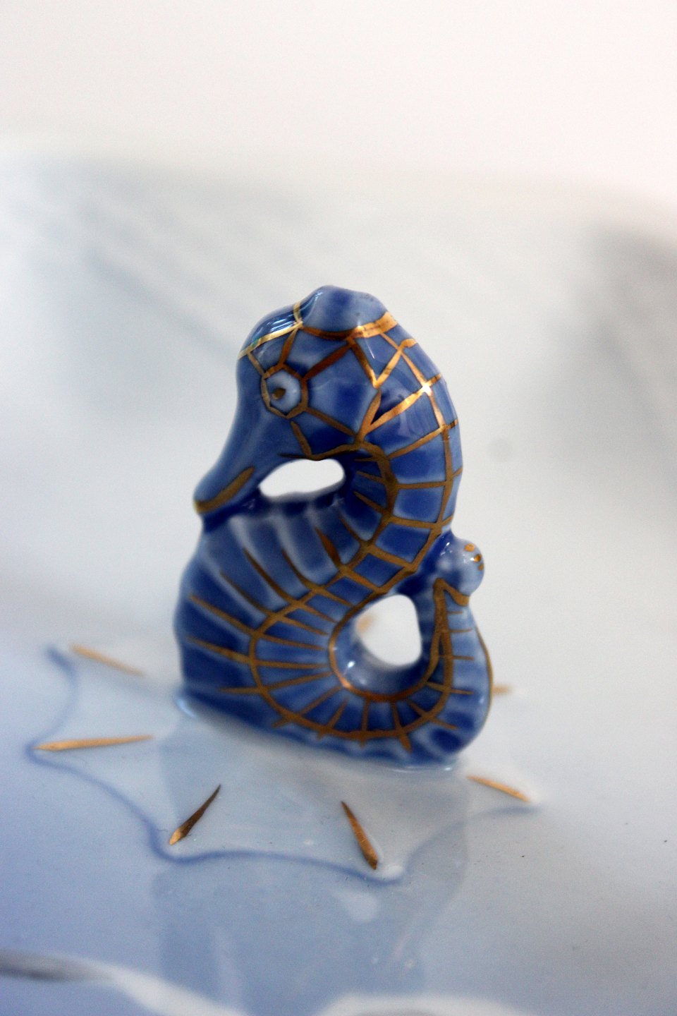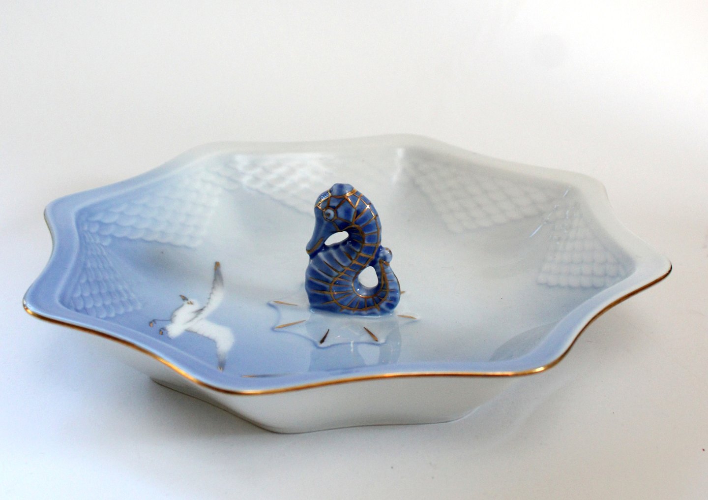 Kantet fad med søhest, Måge med guld, Bing & Grøndahl