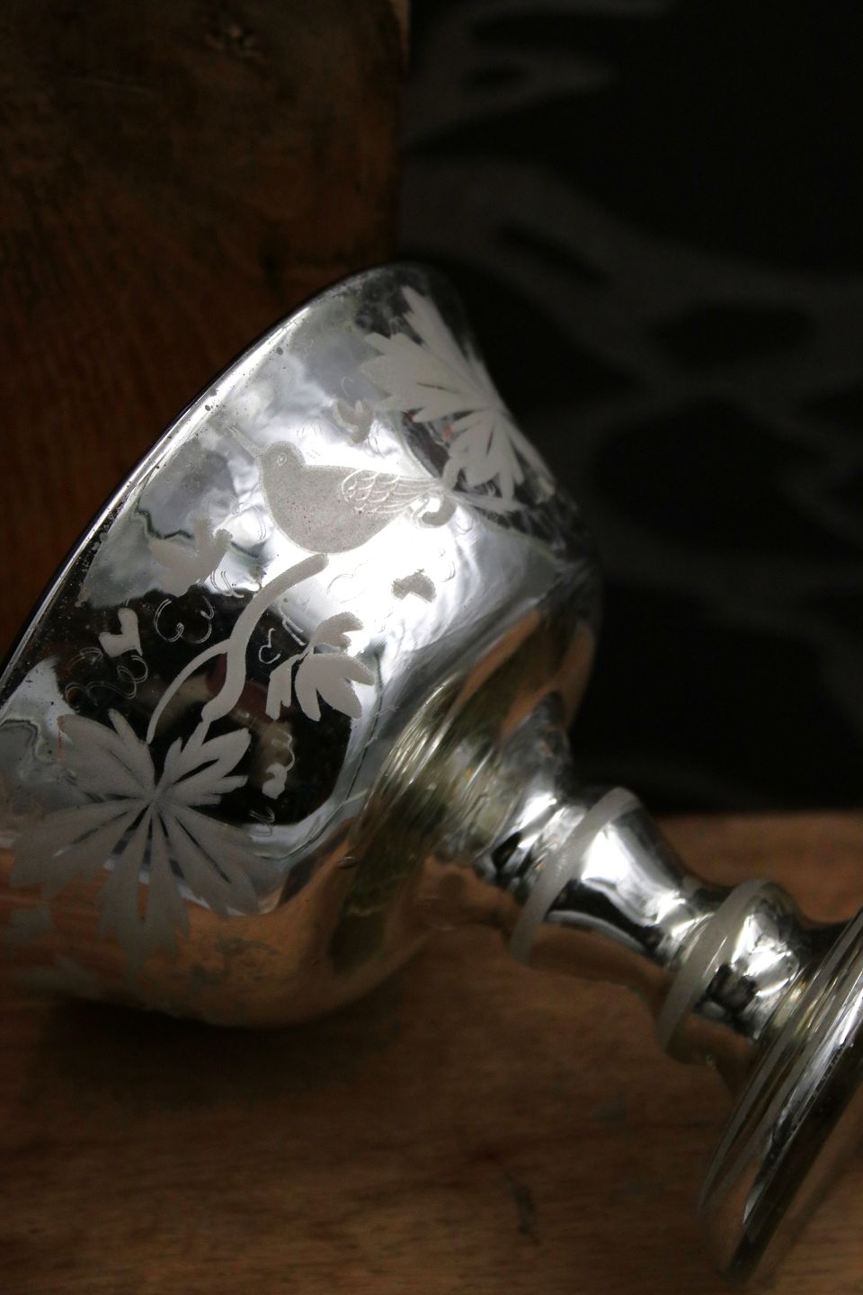 19th century bowl on foot in poor man's silver / Mercury Glass with bird and leaf vine decorations on the side...