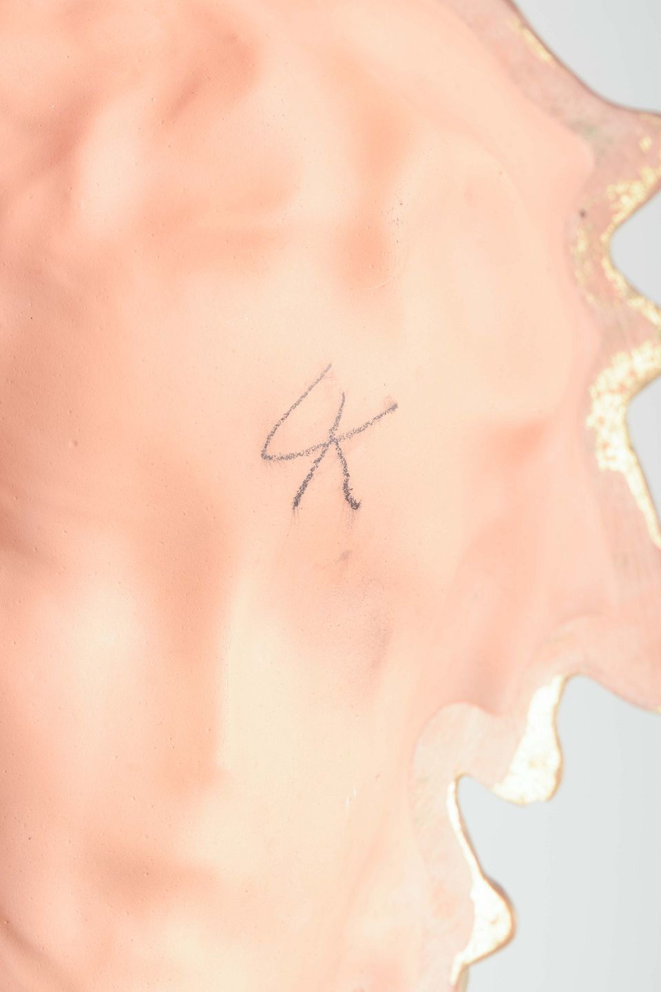 Decorative terracotta wall relief depicting a stylised woman’s head with large eyes, wavy hair and a loop earring. Finished in gold paint. Signed.