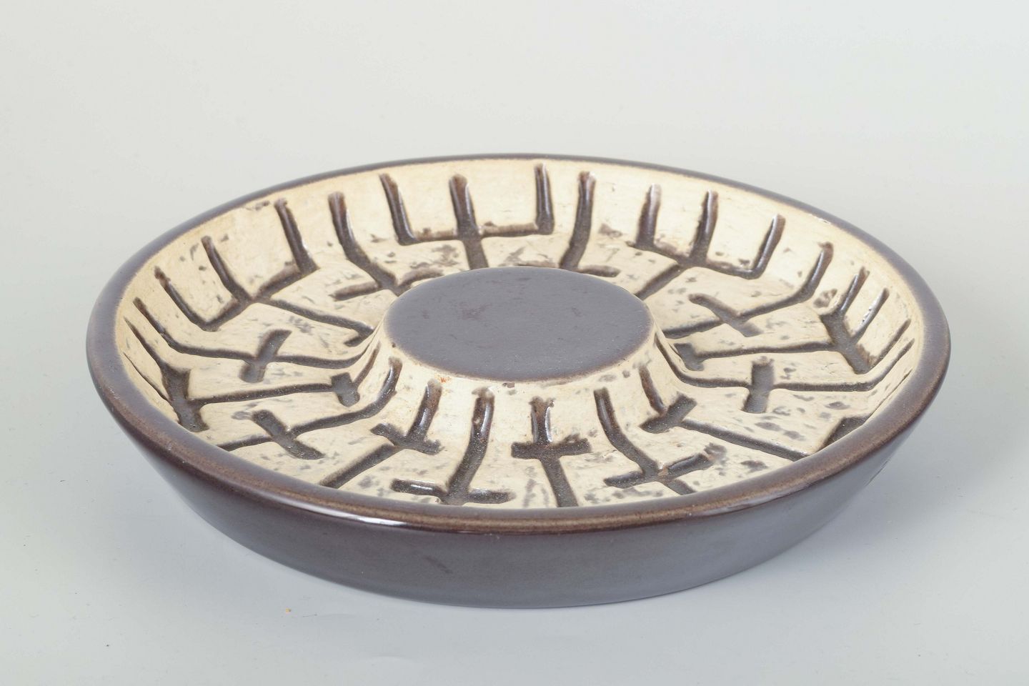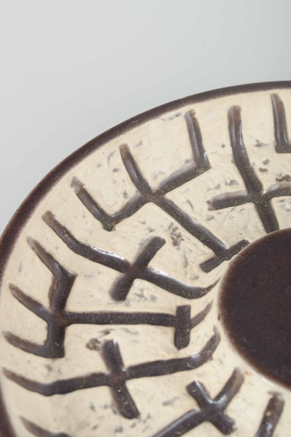 Decorative stoneware bowl with light glaze and brown relief ornamentation forming a bold, radial graphic pattern.