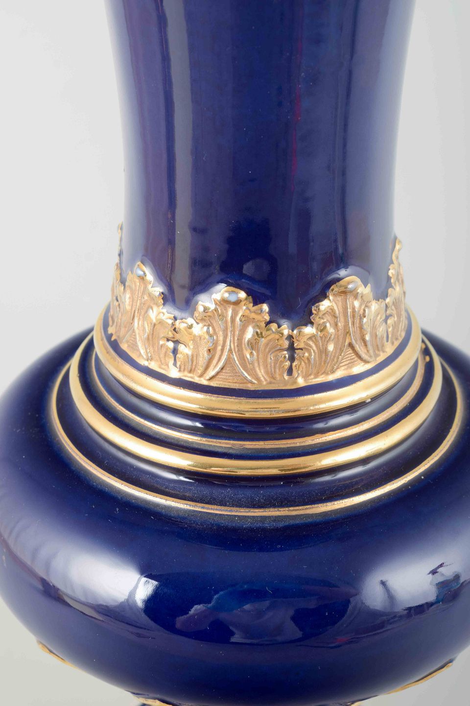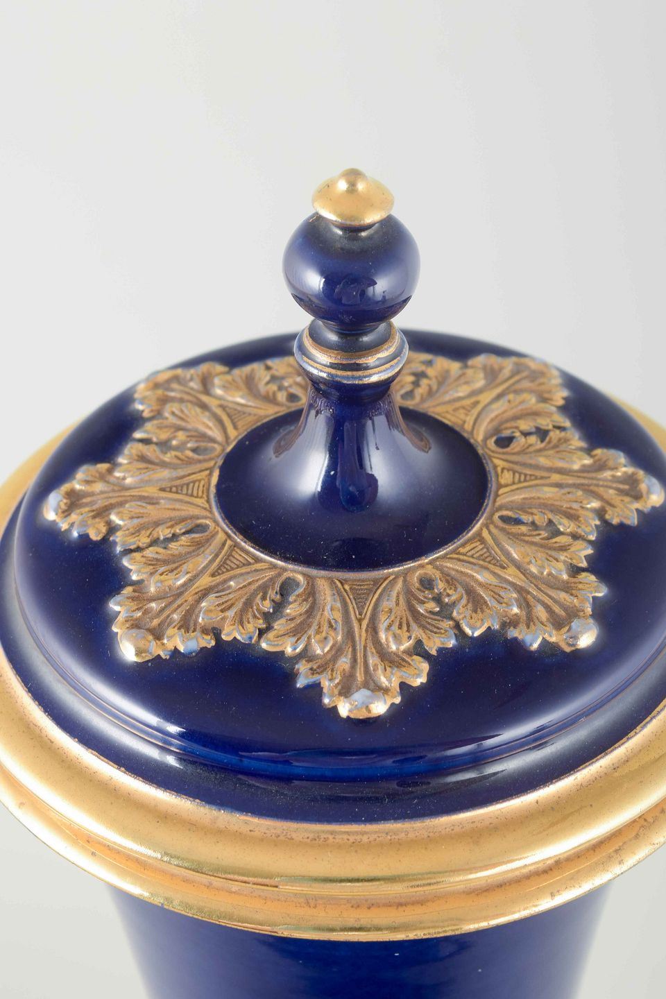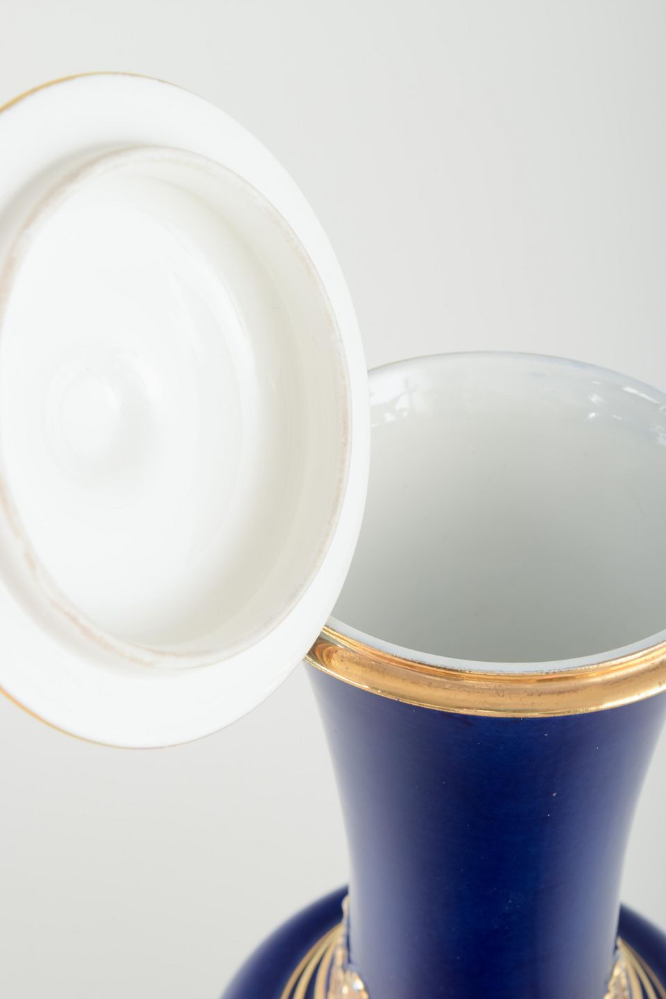 Elegant lidded vase in deep cobalt blue glaze, richly decorated with gilded acanthus and band motifs. Classic form with a profiled base and flared neck, executed in Meissen’s characteristic fine quality.