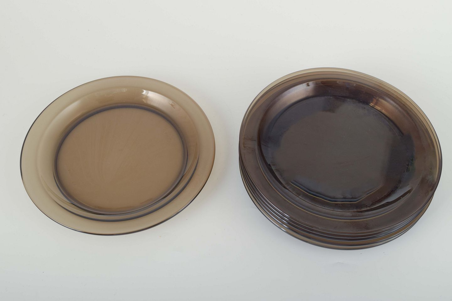 Set of six plates in smoked glass. A classic French design by Vereco, known for its functional household glassware with simple lines and warm tones, characteristic of the 1970s.