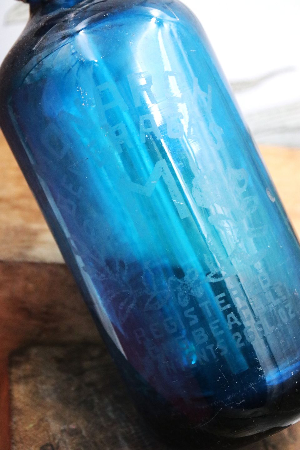 Decorative, old French glass siphon in blue with engraved writing on the side of the siphon...