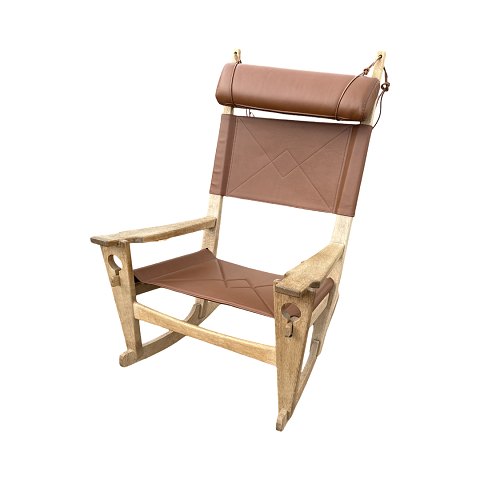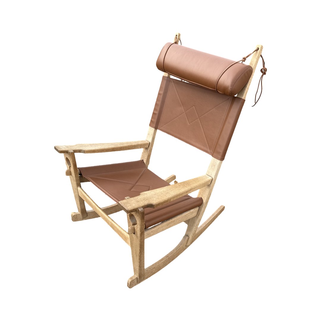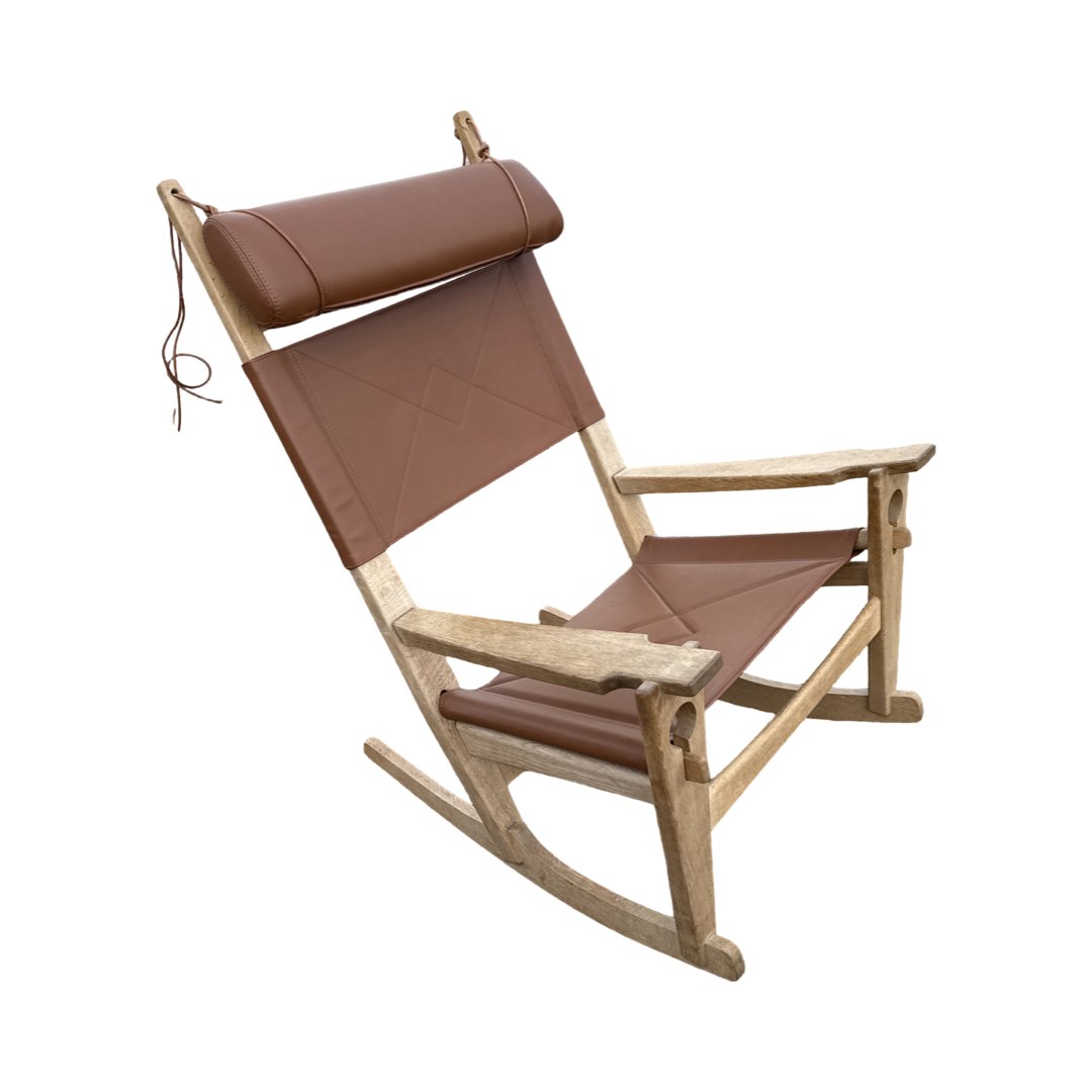 Elegant og eftertragtet Hans J. Wegner nøglehulsgyngestol, udført i massivt egetræ og nyligt ompolstret i cognacfarvet læder (fakturapris 6.000 kr., 3 mdr. gammel – dokumentation medfølger). Stolen fremstår flot, med lækkert patineringspotentiale og høj siddekomfort.