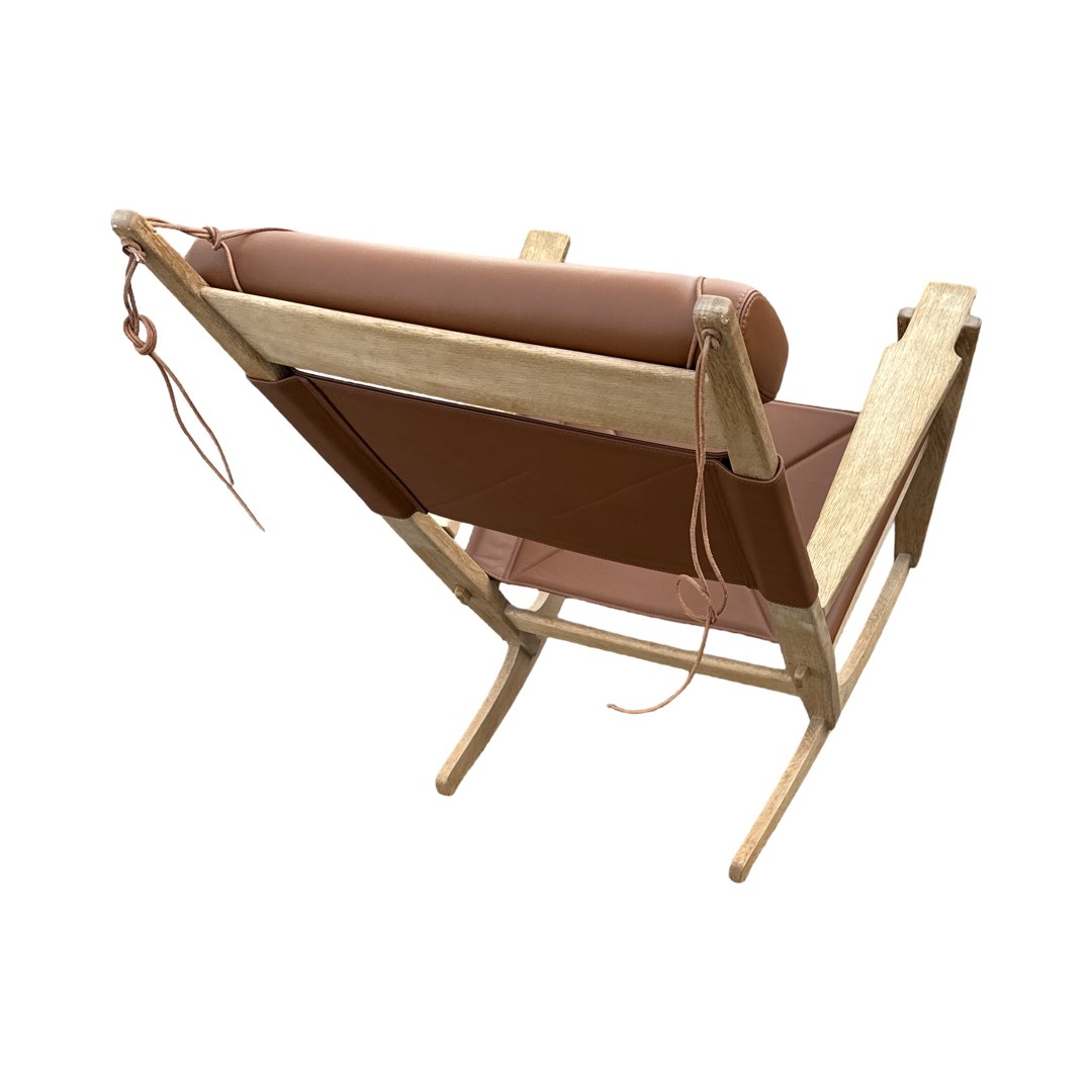 Text available in Danish: Hans J. Wegner – Gyngestol GE 673 “Nøglehullet” i eg m. nyt cognacfarvet læder