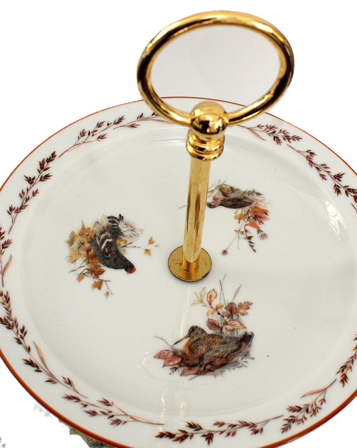 Text available in Danish: Jagtstellet designet af Mads Stage for Imerco. Tallerken etagere, Tallerken opsats. Yderst sjælden. Der er 3 forskellige vildtfugle på hver tallerken, som svarer til de 6 vildtfuglemotiver på stellet.