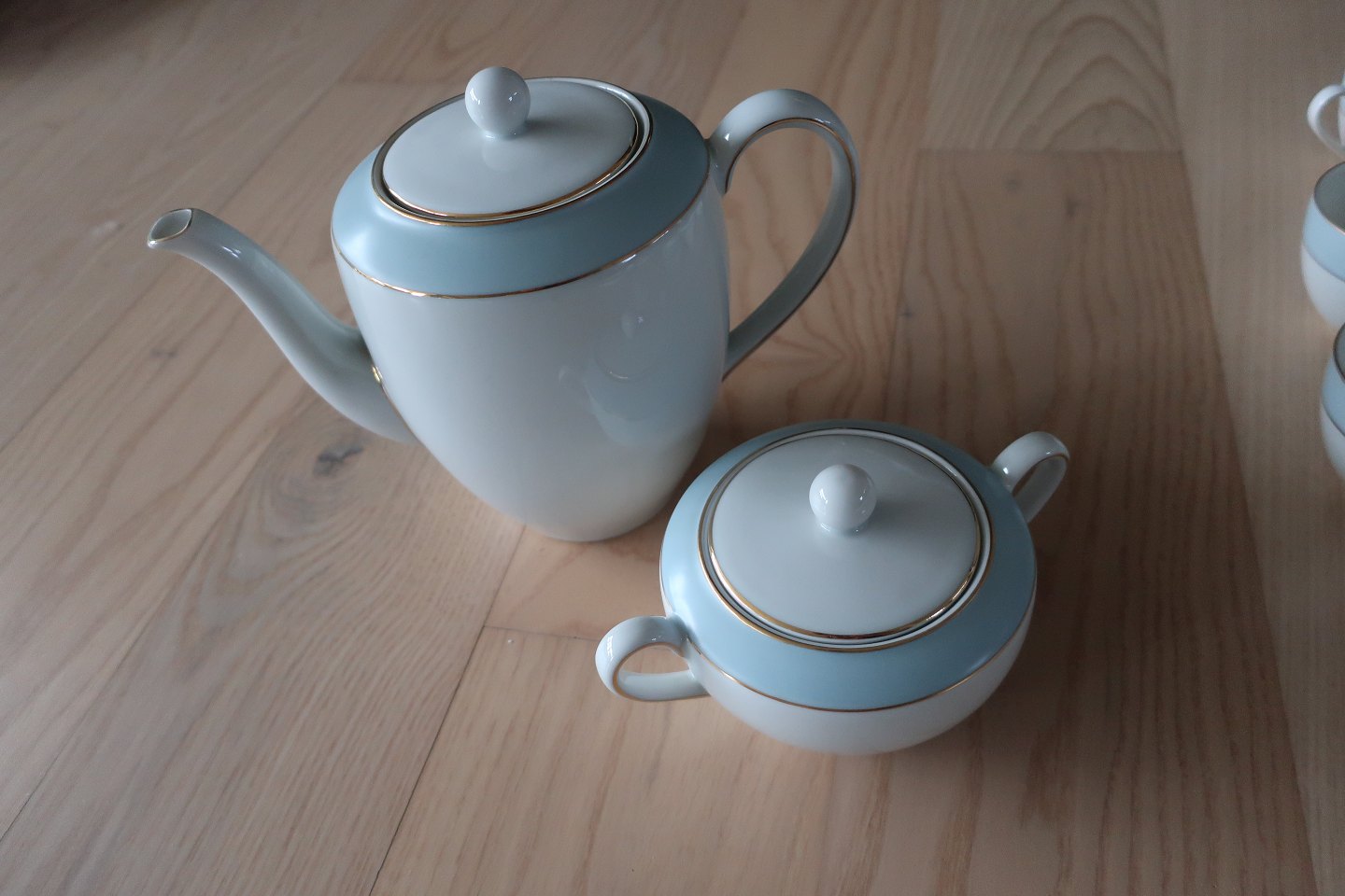 A good and light service: White with a wide light blue rim and 2 golden stribs