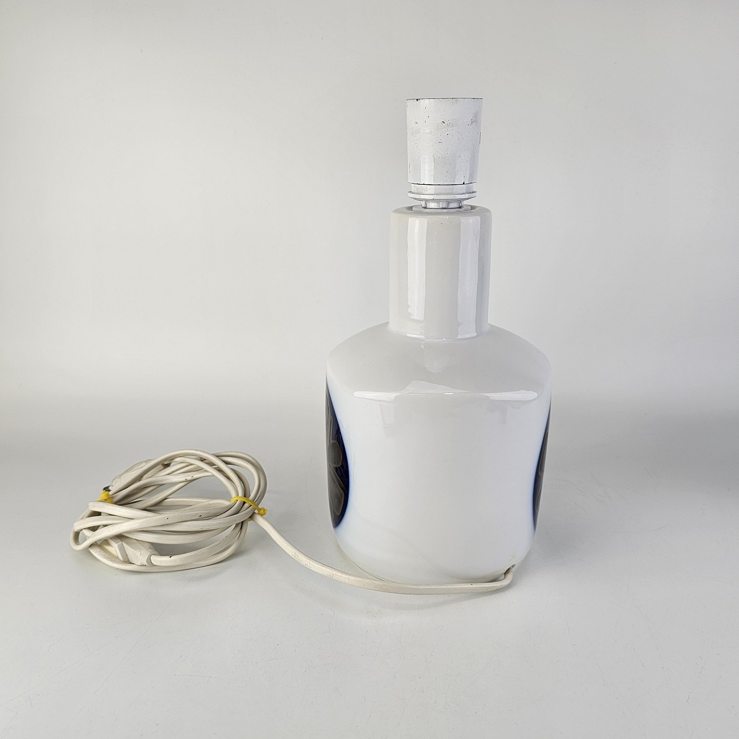 Bordlampe i hvidt porcelæn med abstrakt dekoration i blå og grå