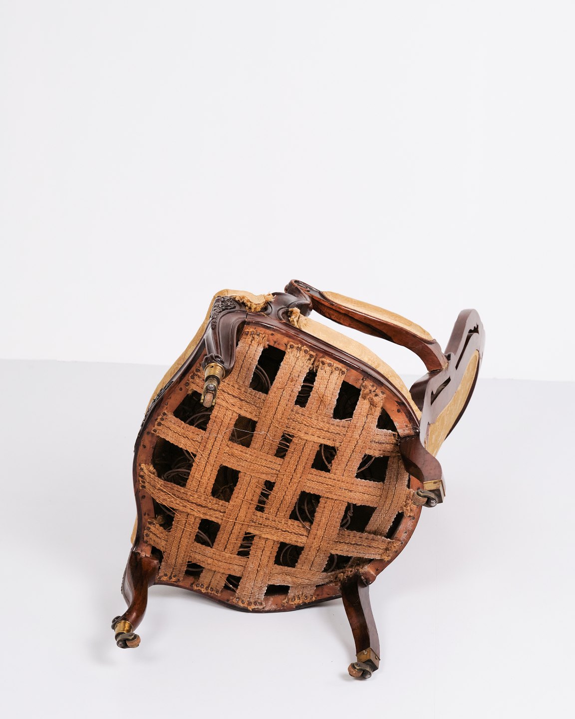 Antique armchair made of mahogany with carved details in the Rococo style, dated to around the 1890s. The seat and back are upholstered with floral upholstery.