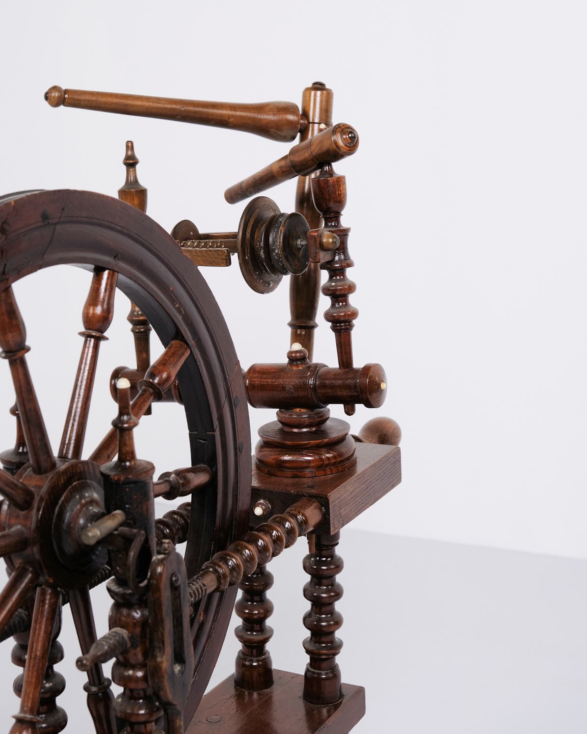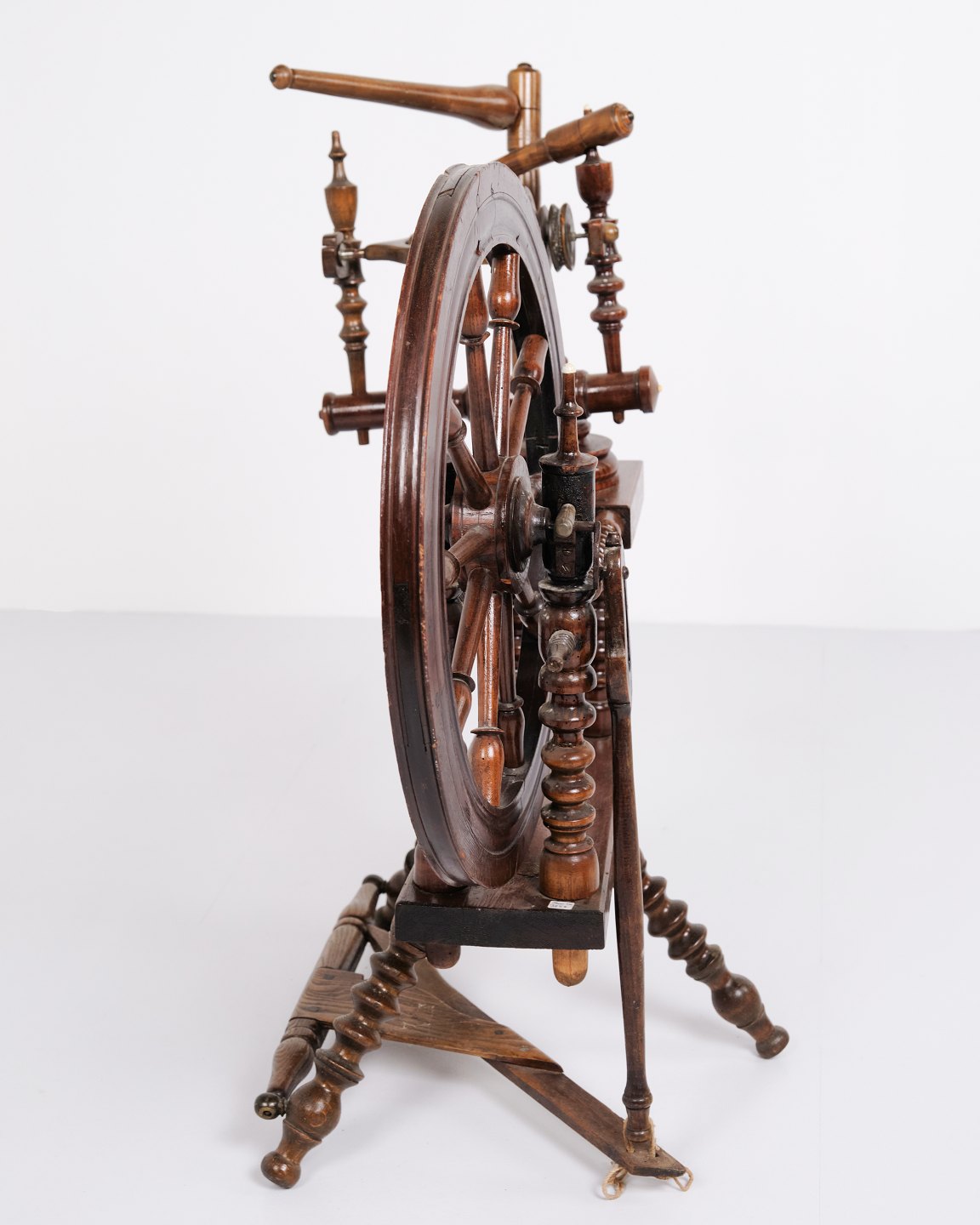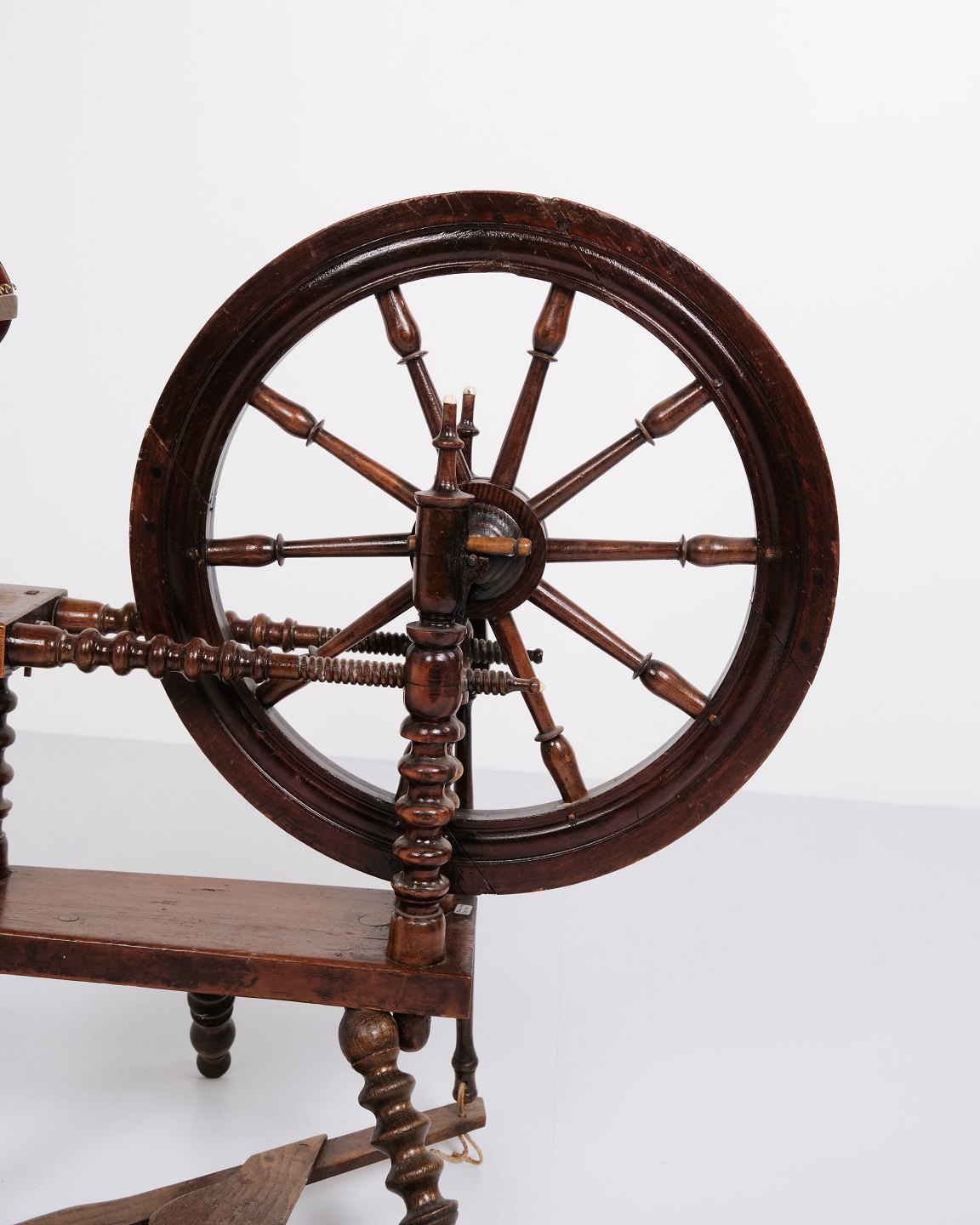 Antique spinning wheel from the 1880s in hand-polished dark wood.
