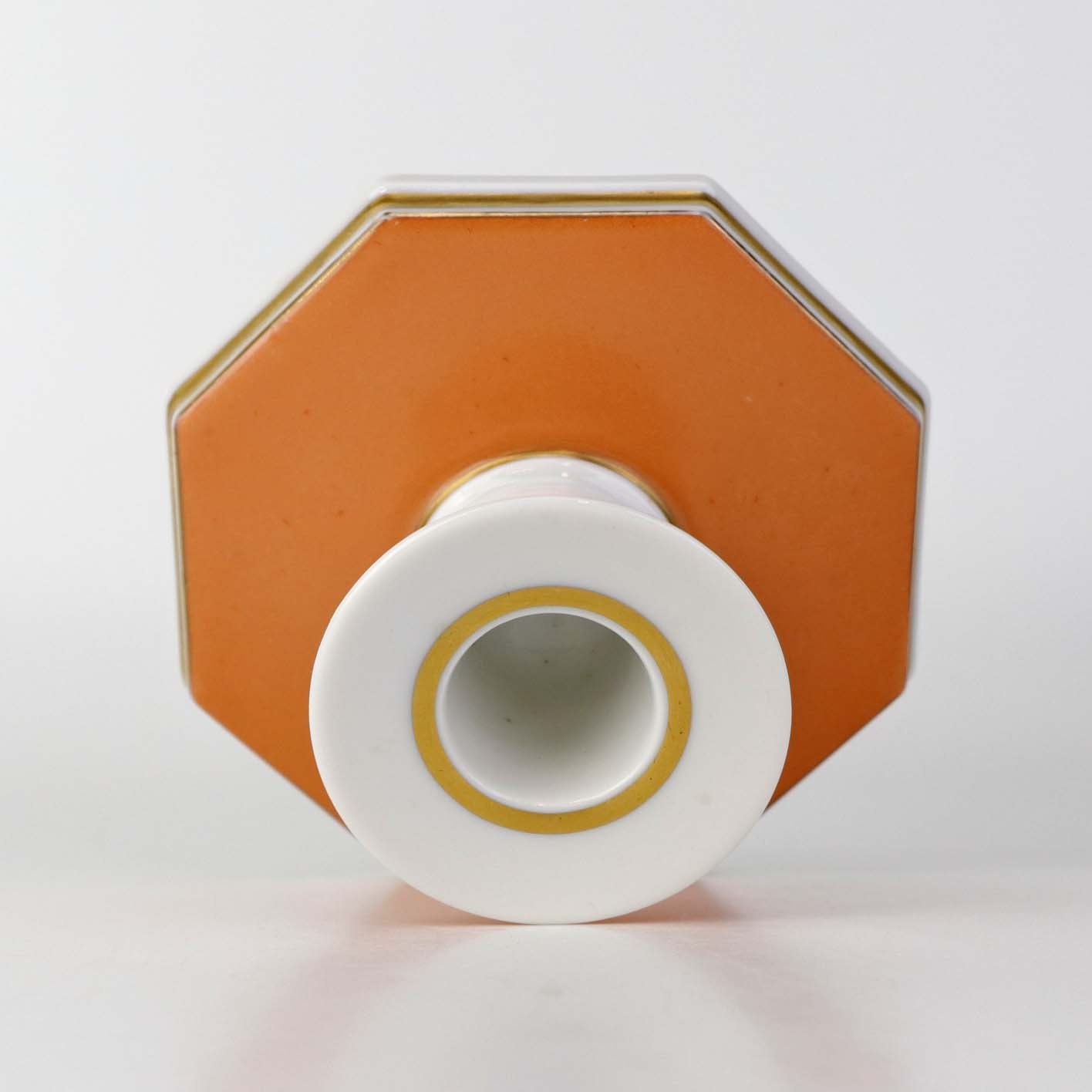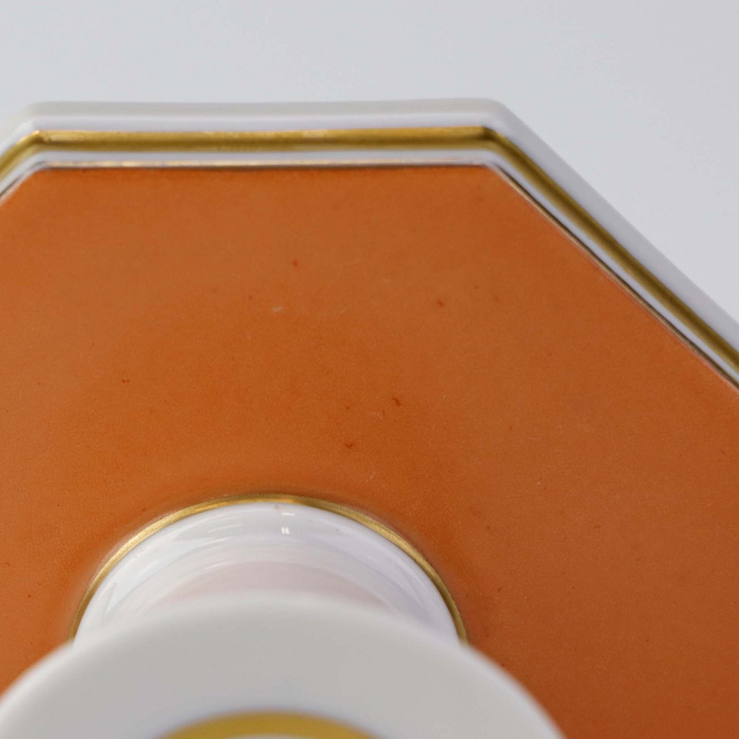 Service i glat hvidt porcelæn med orangerød dekoration over glasuren og guldkant