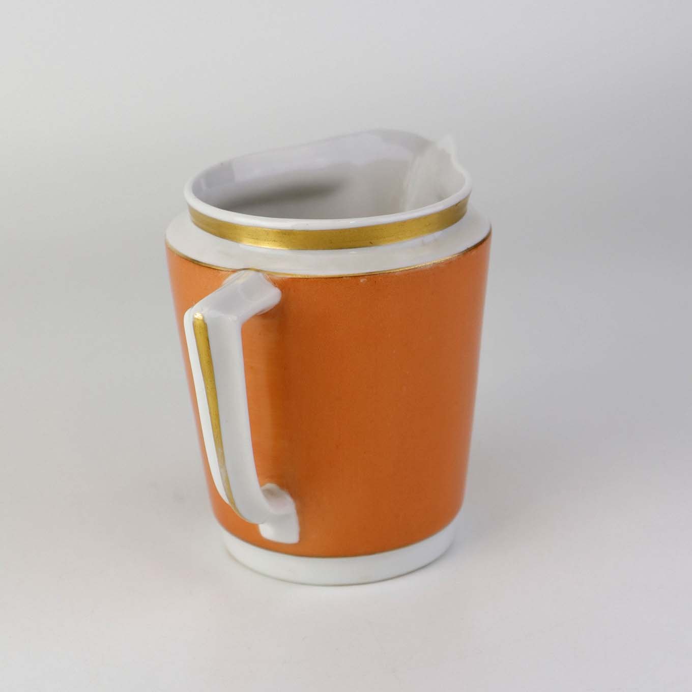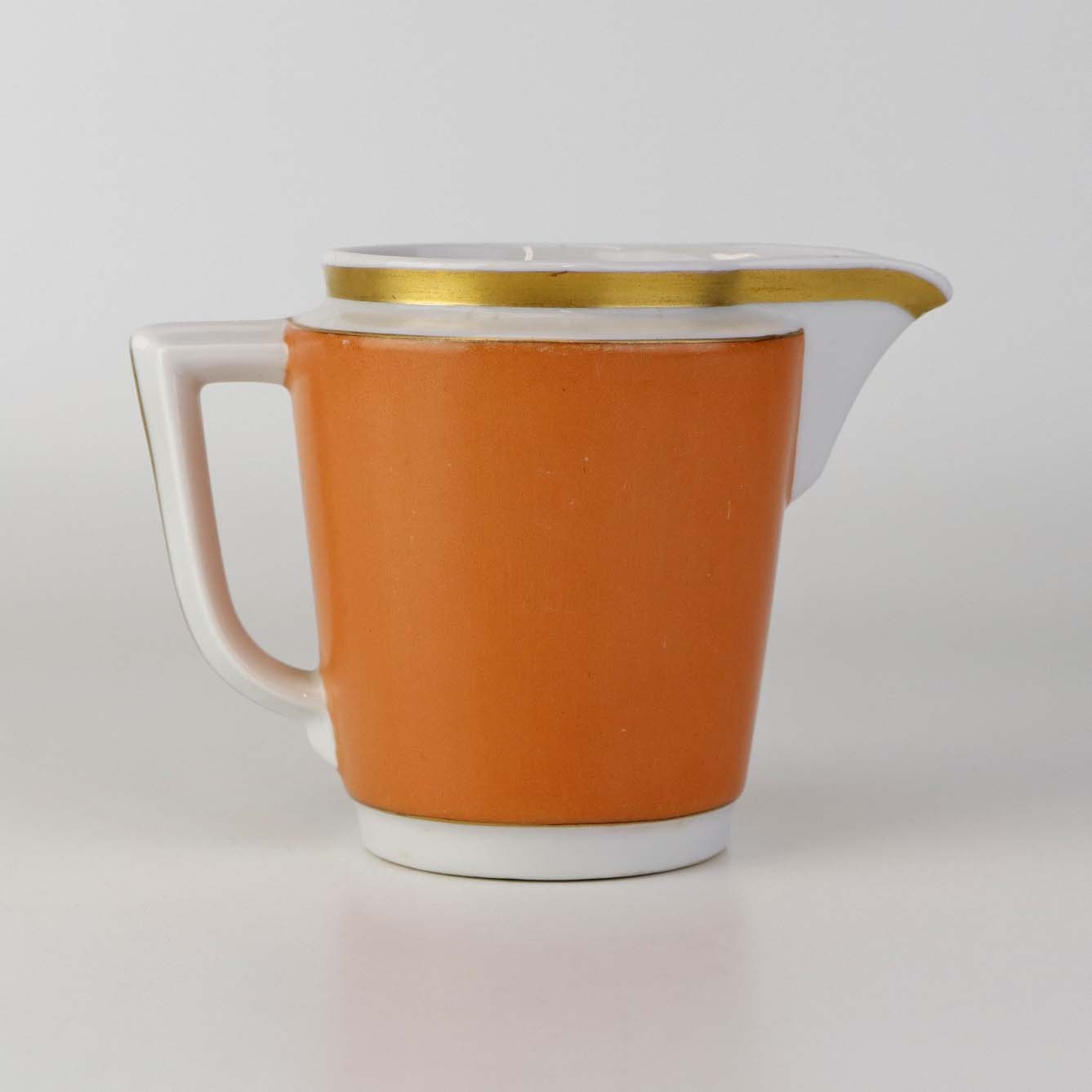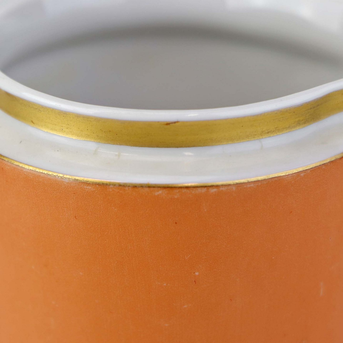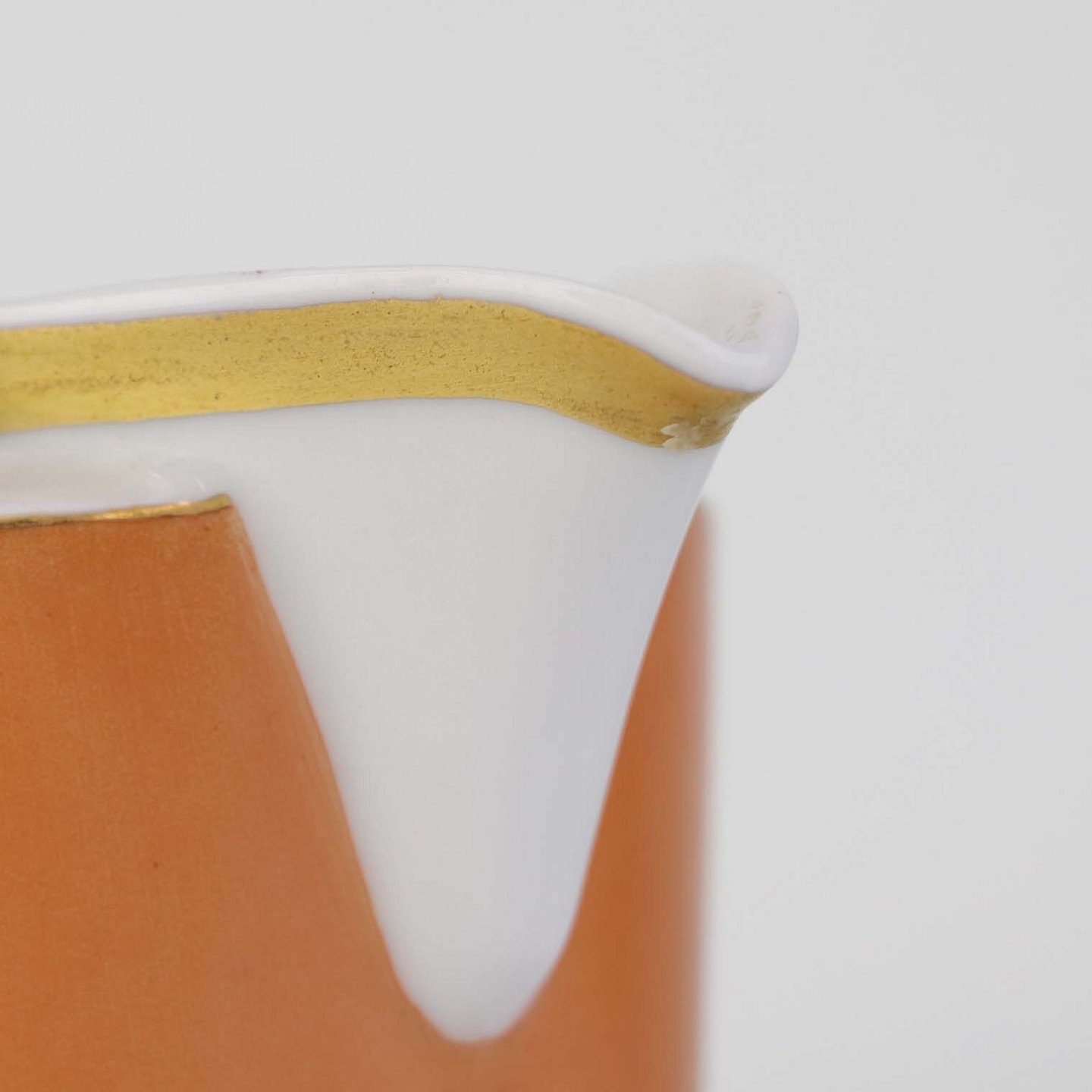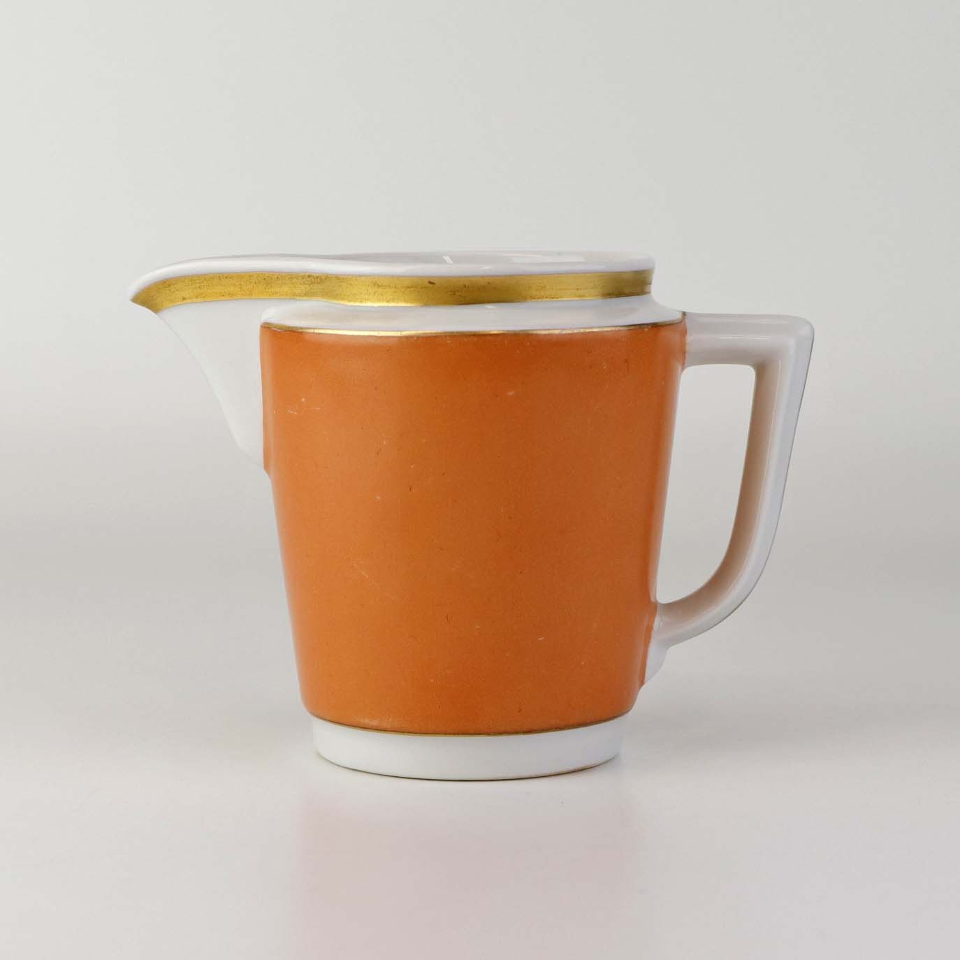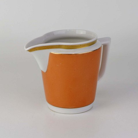 Service i glat hvidt porcelæn med orangerød dekoration over glasuren og guldkant